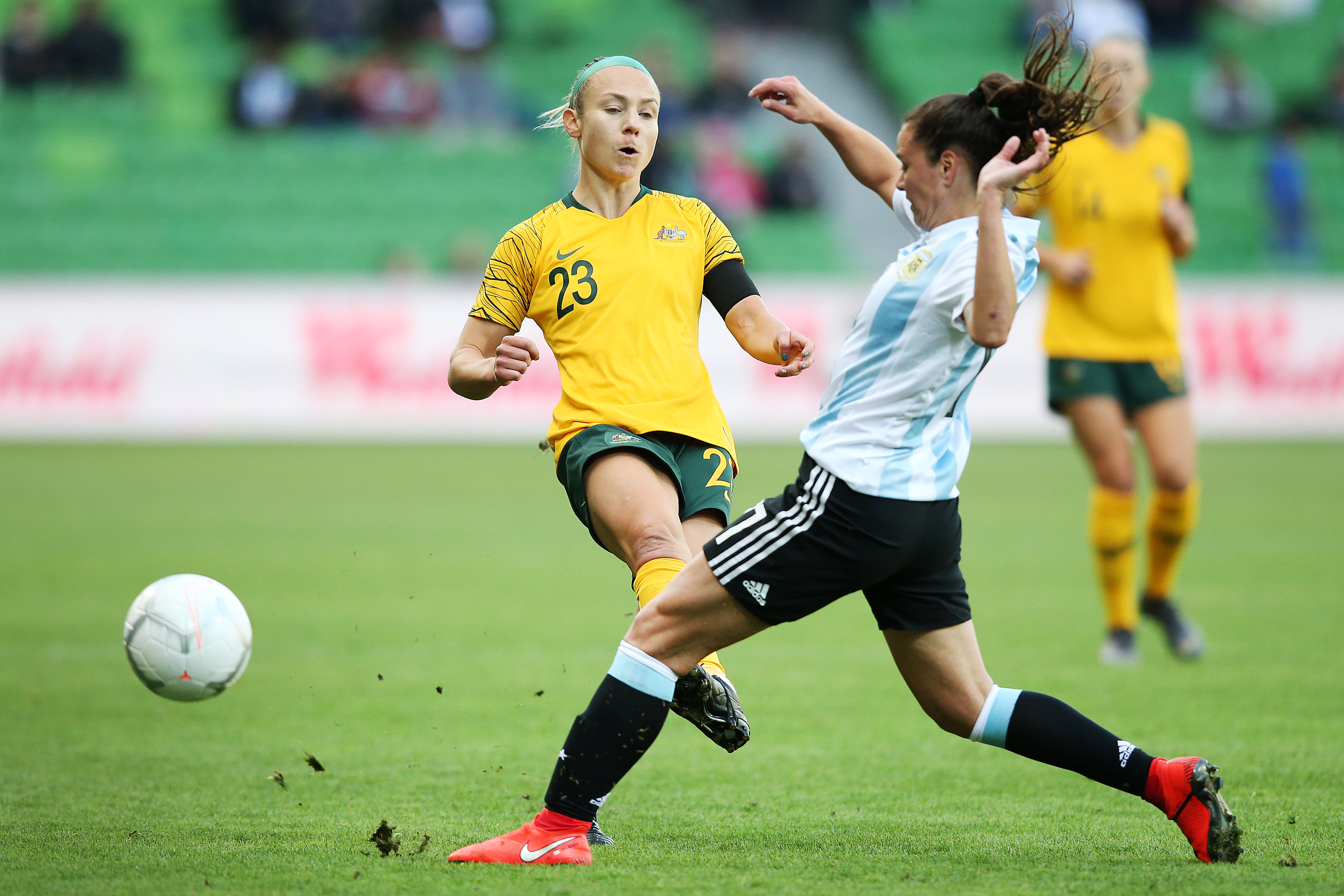 MELBOURNE, AUSTRALIA – MARCH 06: Teigan Allen of the Matildas passes the ball past Florencia Bonsegundo during the Cup of Nations match between Australia and Argentina at AAMI Park on March 06, 2019 in Melbourne, Australia. (Photo by Michael Dodge/Getty Images)