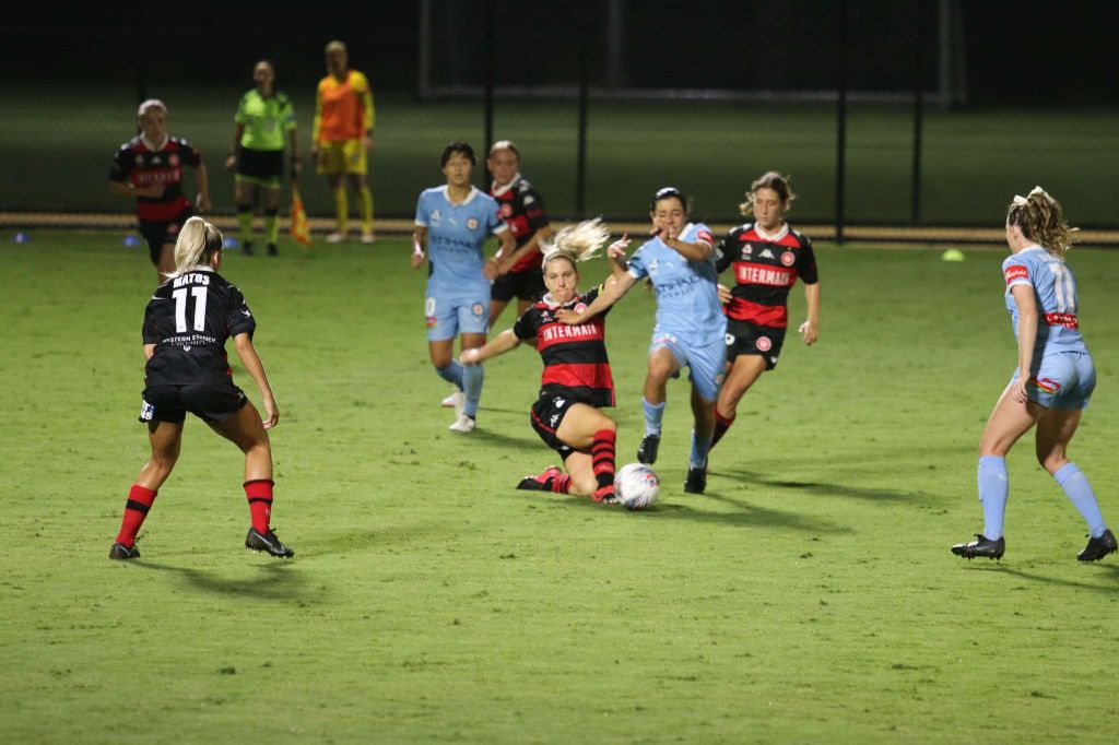 Wanderers are playing 4-3-3 and City are playing 5-3-2 with a bigger emphasis on defence. Early on, the Wanderers seem to be controlling play and have the bulk of possession and territory. There’s a battle brewing between Sam Johnson in attack for City and Georgia Yeoman-Dale for Wanderers in defence as that seems to be City’s primary way forward.