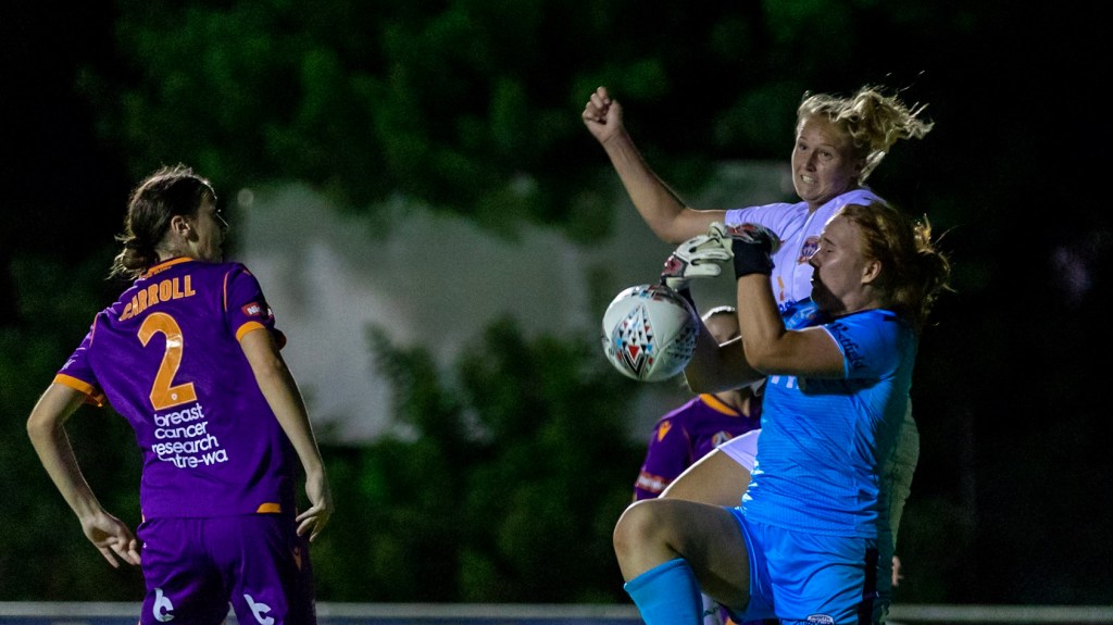 Liz Anton gets a yellow for a foul tackle on Lauren Allen. Taren King takes the free kick and sends it cross field to Tiana Jaber. She lobs it into the box and Allen runs onto it in free space with just Lily Alfeld to beat in the Perth goal. The keeper blocks the shot but Allen still has possession and gets past on the left in front of the open goal. The defence recover by the time she has it under control and it goes back to the right to Tara Andrews, whose shot is blocked. It rebounds and is scooped up by Alfeld. How the Jets didn’t score then is not clear but the Glory did a great job of scrambling their defence.