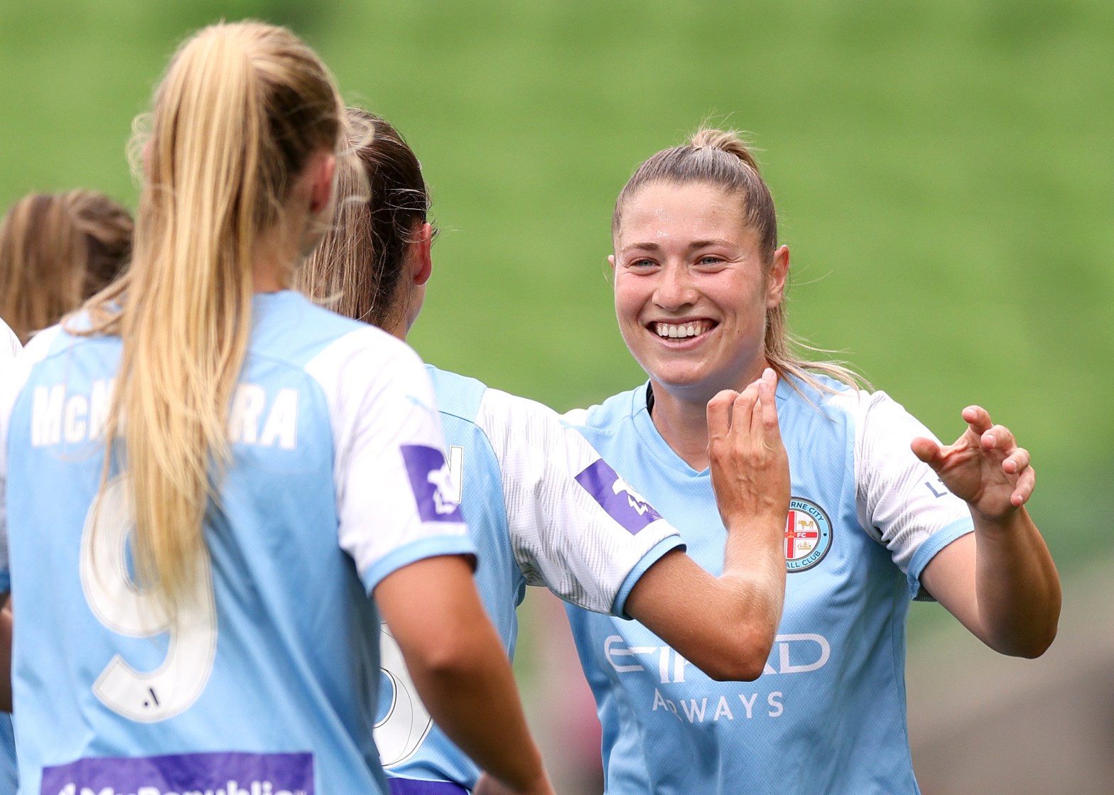 Above: Rhianna Pollicina celebrates her opening goal with team-mates including Holly McNamara who would later suffer a potentially season-ending injury. Photo: Melbourne City