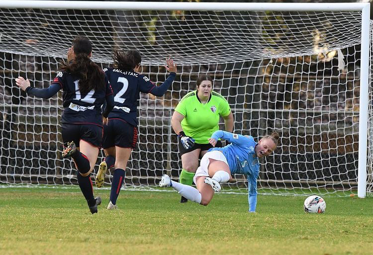 However as the half wore on, the more the visitors gained in territory and possession. On 25 minutes a sustained period of pressure saw them come close. The ever-dangerous Barreiro curled in a free-kick from the left which the hosts only partially cleared. Jaime Duncanson recycled the ball in from the opposite flank for Spadano. Balcatta averted the danger at the cost of a throw parallel to the 18-yard box on the right which led to a corner for the visitors. Duncanson pulled the flag-kick in for Abbey Meakins to get a shot in as the ball rebounded off the back of Cass Harvey. Dal Busco saved well.