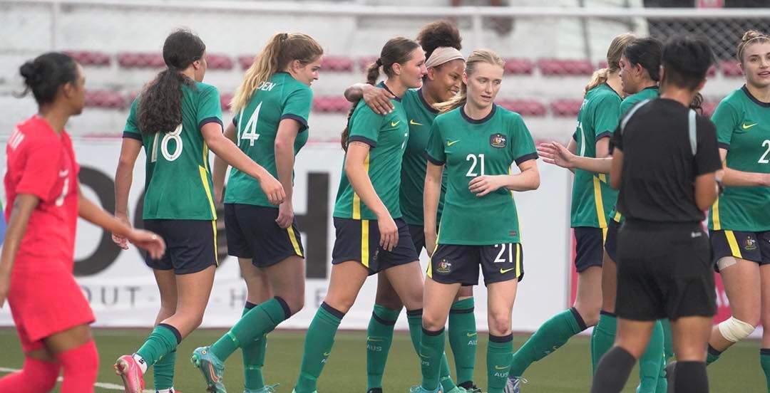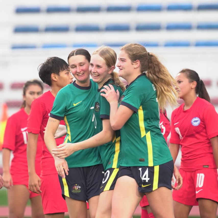 Above: Australia celebrate Winonah Heatley’s early goal that put them ahead against Singapore today. Photo: Football Australia.