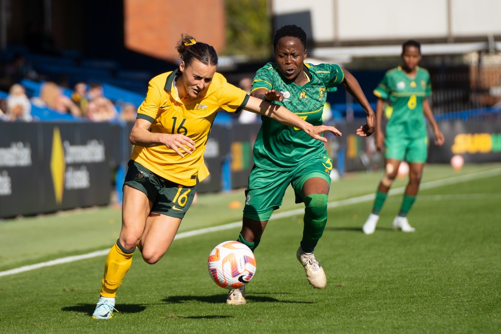 Above: Illness prevented Sam Kerr from coming on before the 83rd-minute mark. Here she takes on Ntsako Makhubela, Photo: Justine Burch for Impetus.