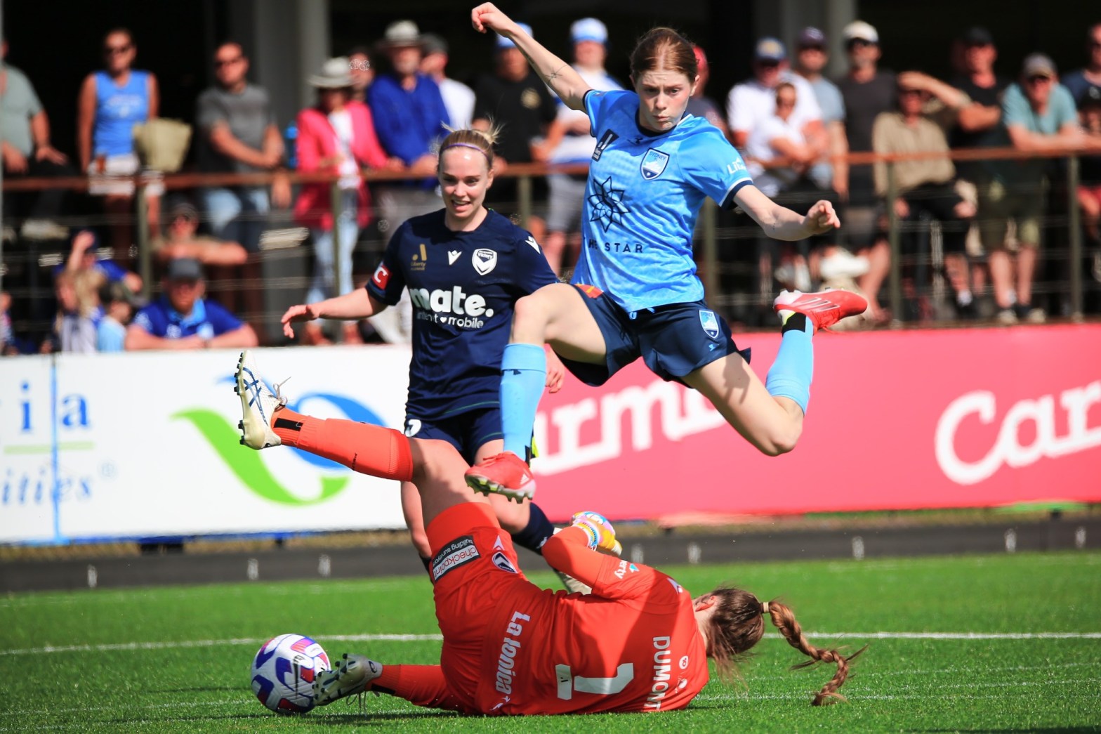 Above: High-flying action as Cortnee Vine leaps over Melbourne Victory goalkeeper Casey Dumont. Photo: Kris Goman for Impetus.