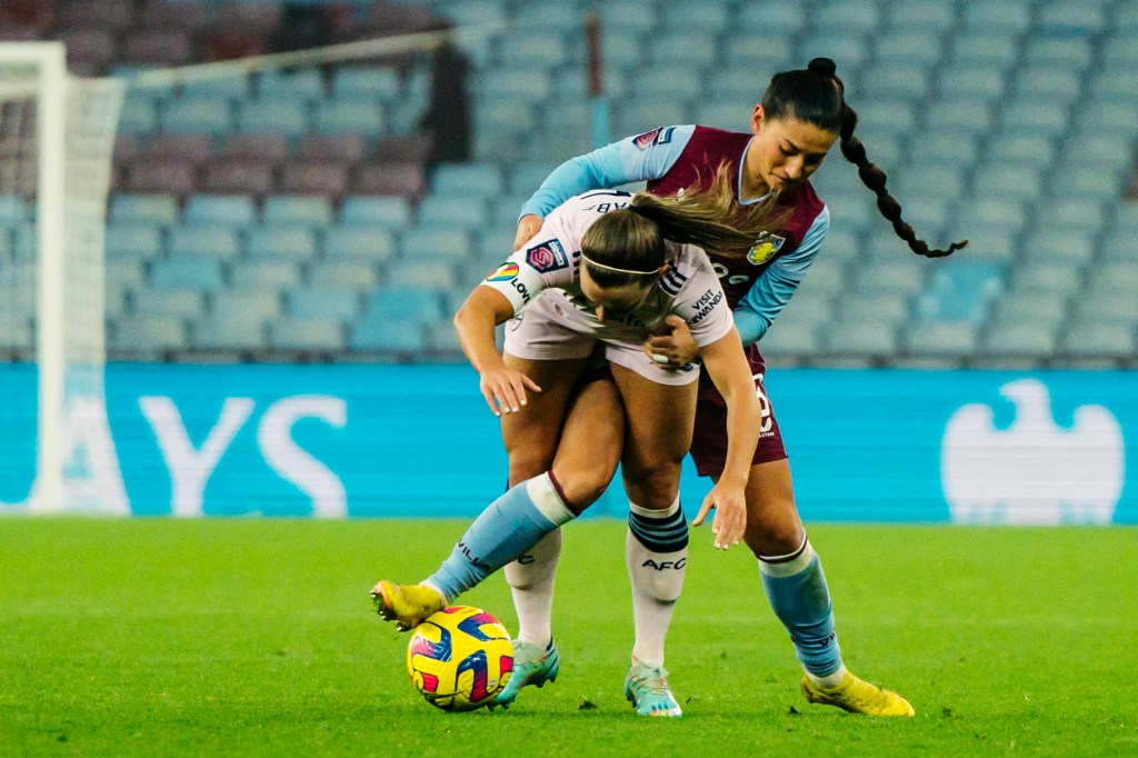 Above: Aston Villa’s Kirsty Hanson (right) holds off the challenge of Arsenal’s Lotte Wubben-Moy. Photo: Suvadeep Biswas for Impetus.