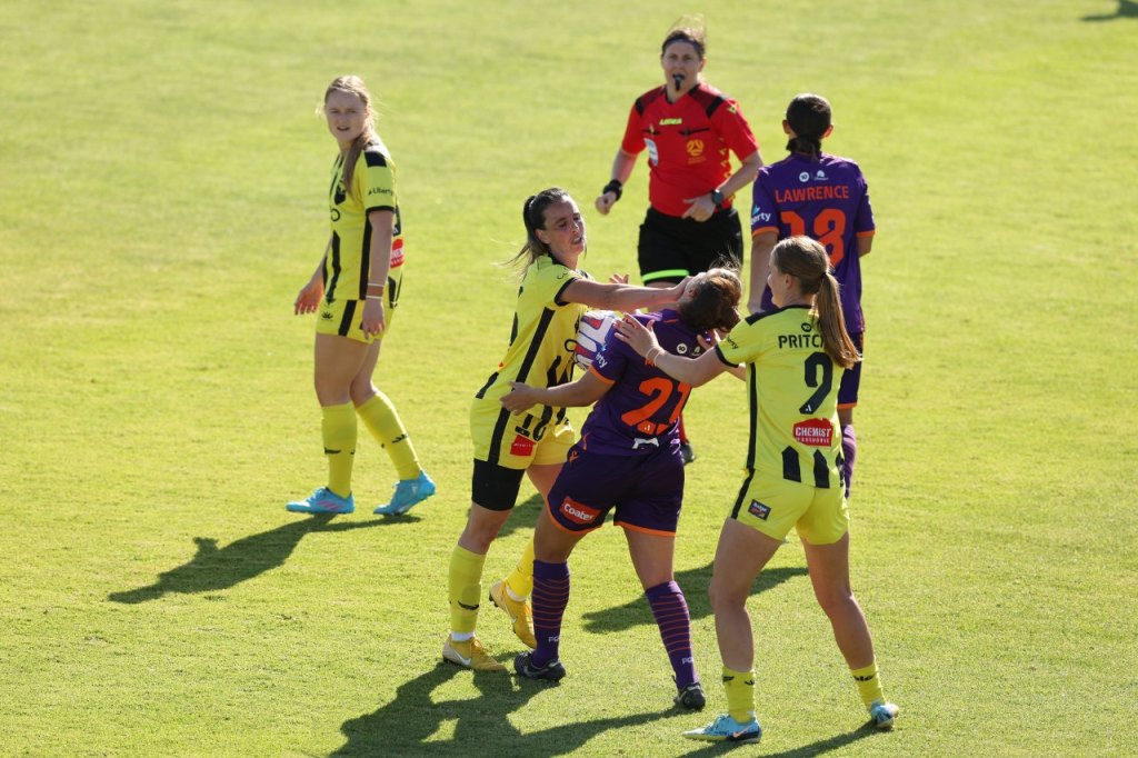 Perth were aggressive from the off with multiple players looking to press and close down Phoenix every time they got on the ball. The purple and orange shirts maintained a high line.