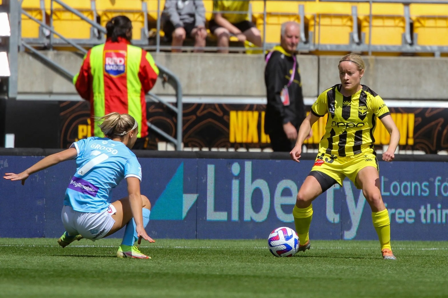 Above: Paige Satchell (right) in action for Wellington Phoenix in their first-ever game on New Zealand soil against Melbourne City in November. Photo: Hagen Hopkins.