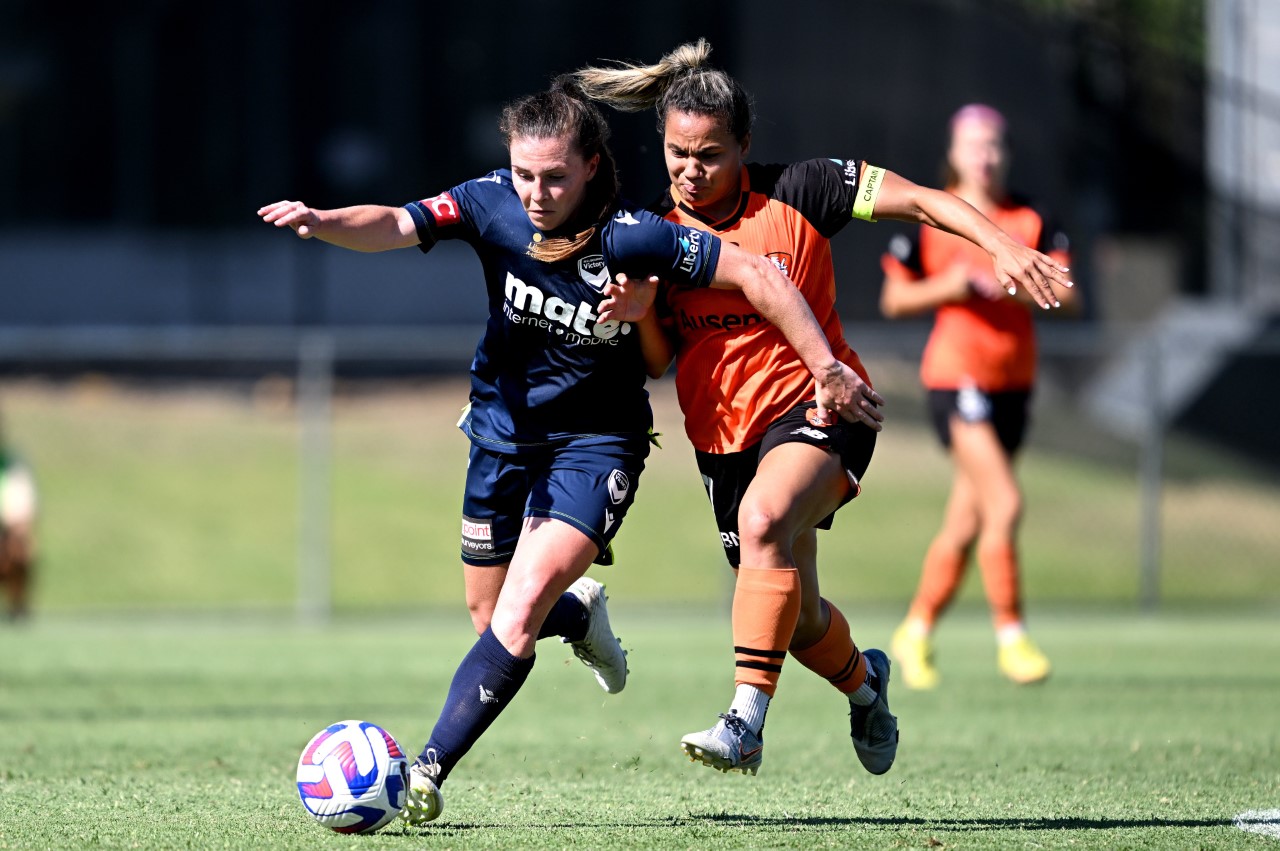 Above: Catherine Zimmerman and Ayesha Norrie compete for the ball. Photo: Brisbane Roar.
