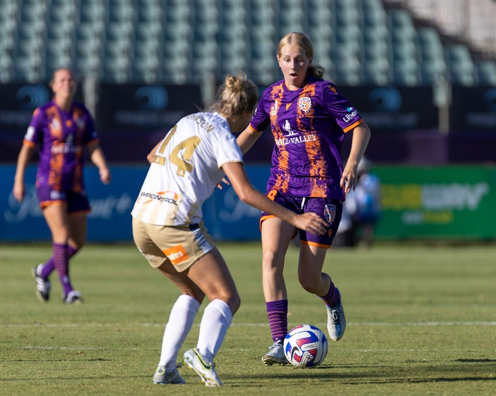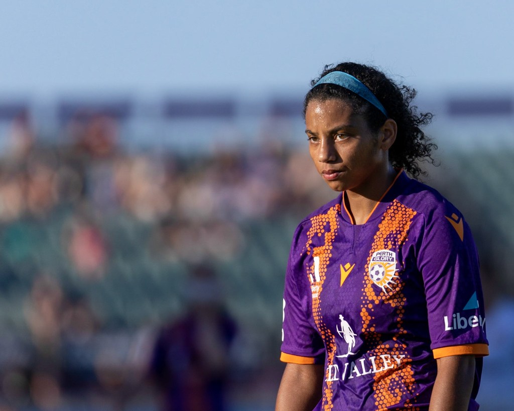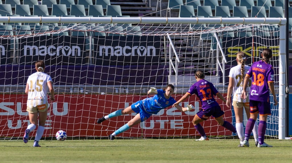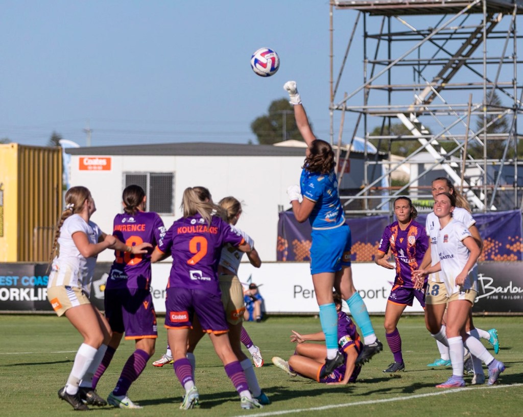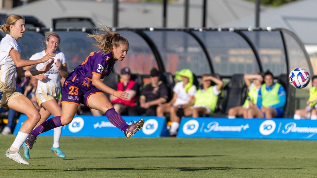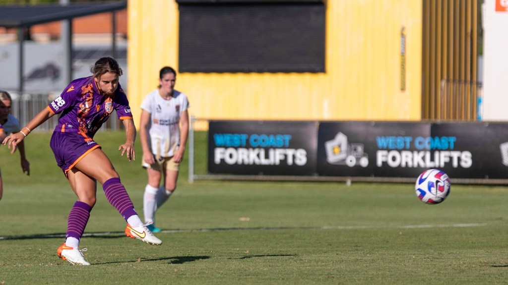 Above: Perth Glory’s Cyera Hintzen hits a cracker from outside of the box. Photo: Tom McCarthy.