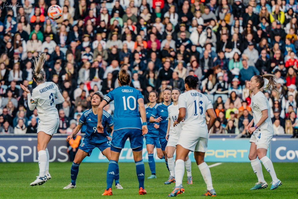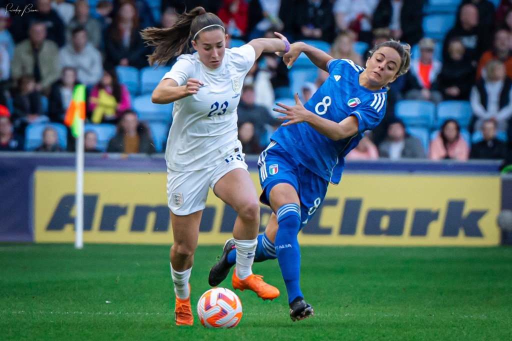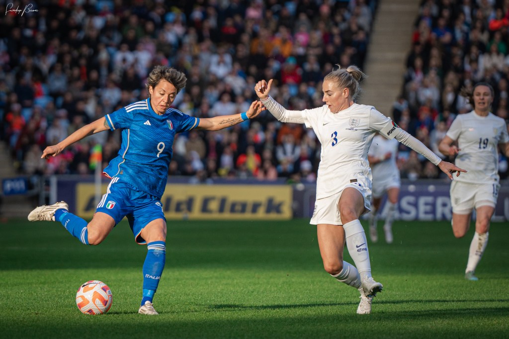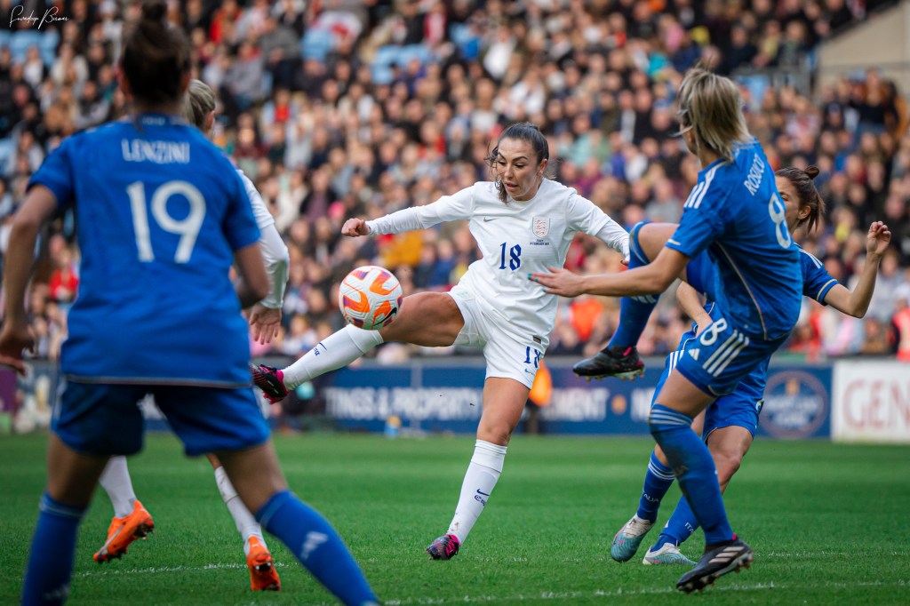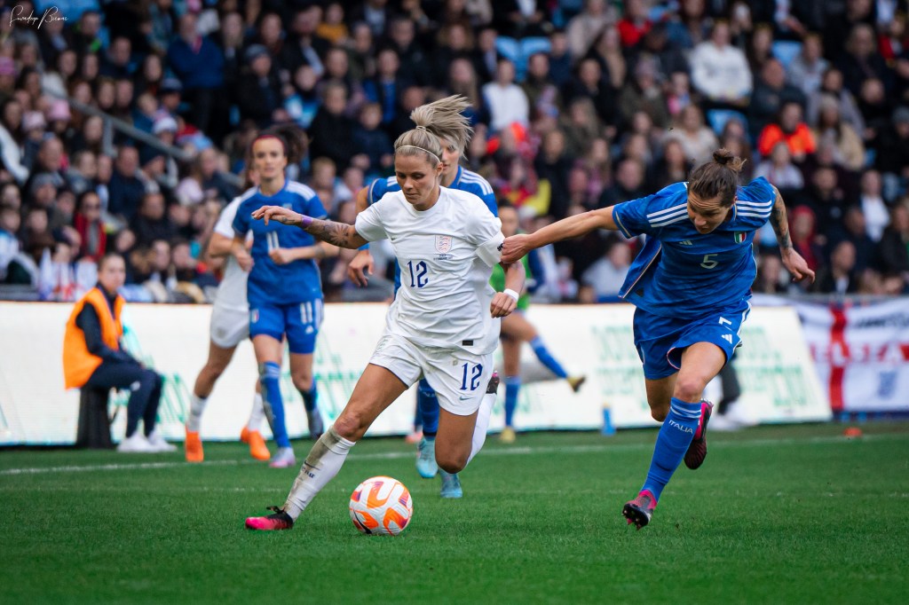 Above: Jordan Nobbs hurdles Italy goalkeeper Laura Giuliai yesterday. Photo: Suvadeep Biswas for Impetus.