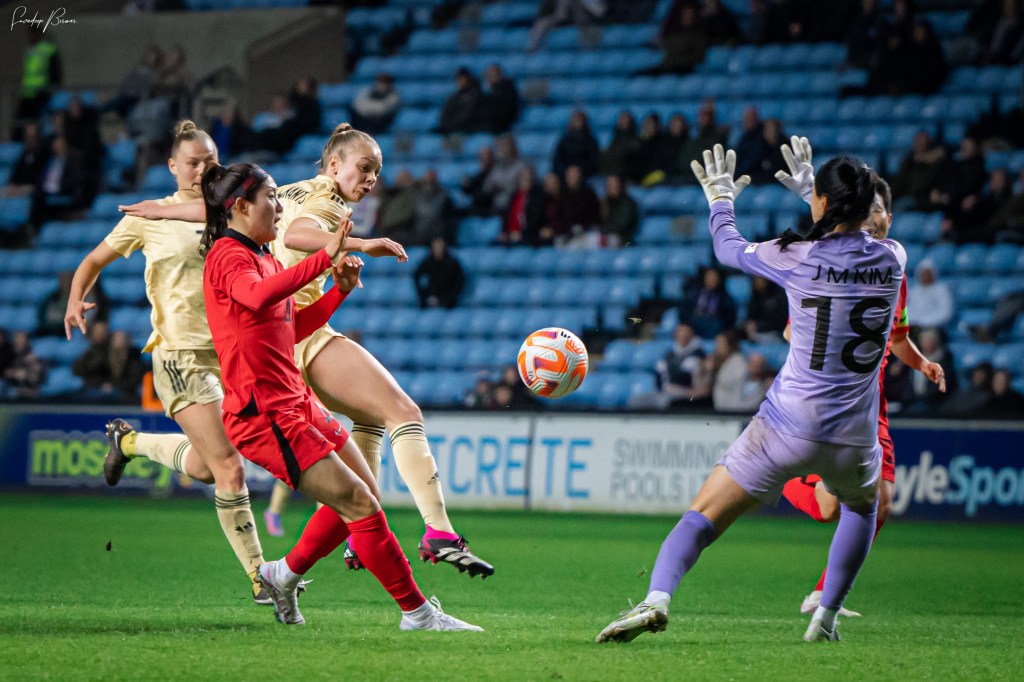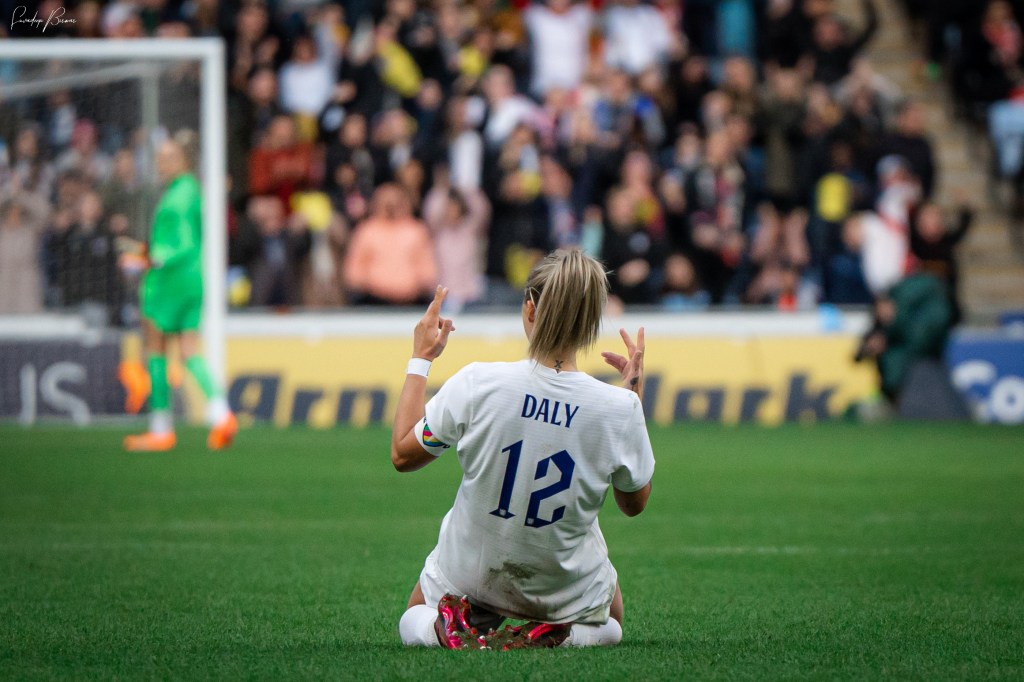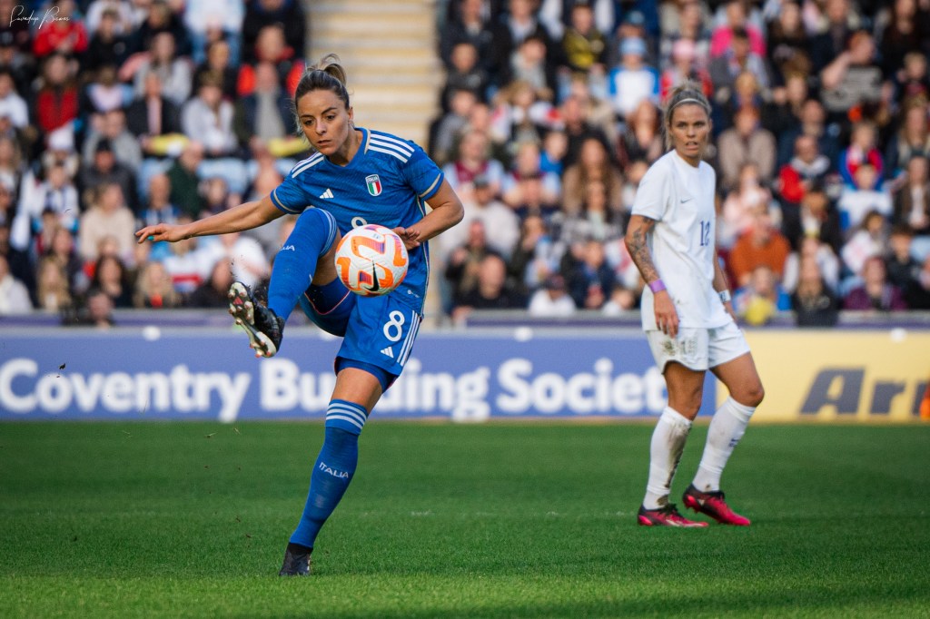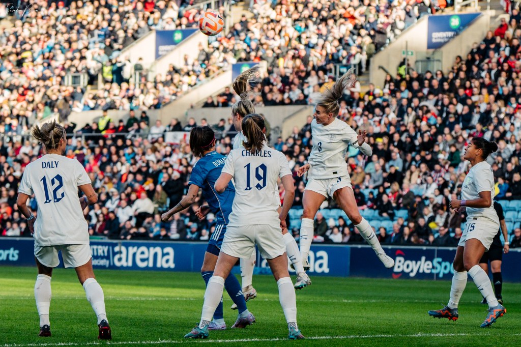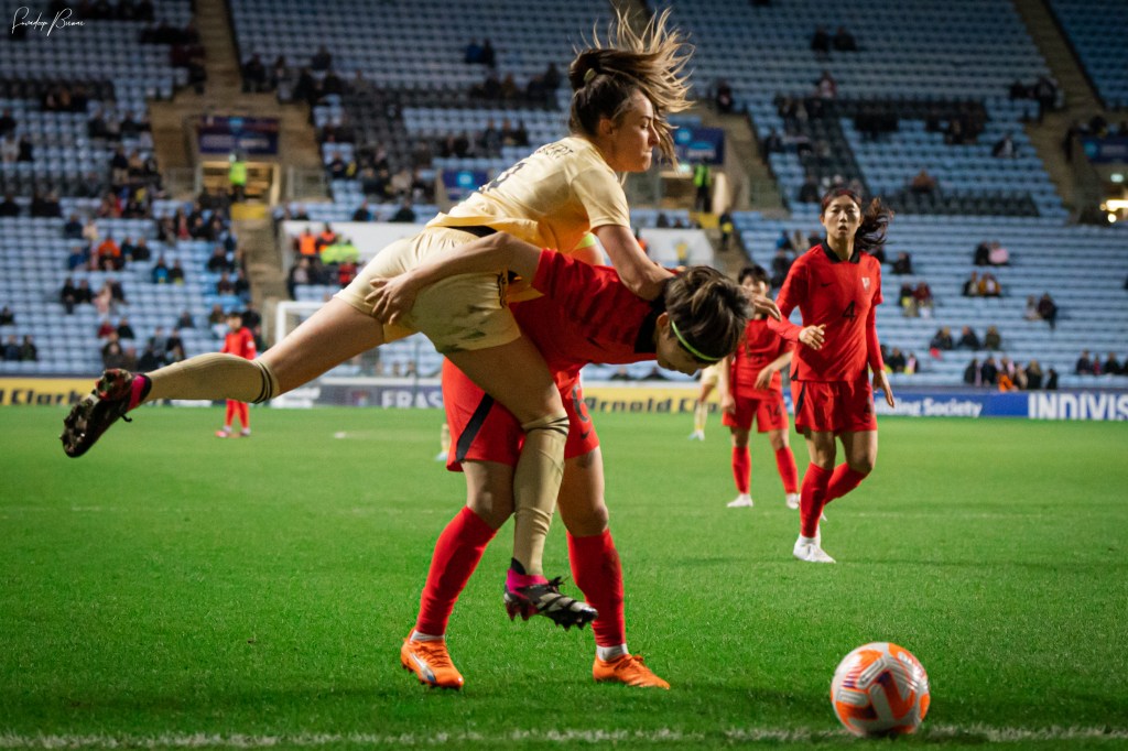 Above: Jordan Nobbs hurdles Italy goalkeeper Laura Giuliai yesterday. Photo: Suvadeep Biswas for Impetus.