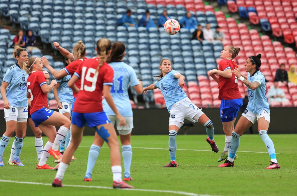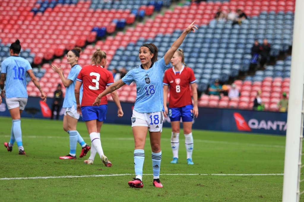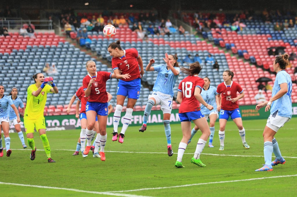 Above: Spain get a header in on goal against Czechia today in Newcastle, New South Wales. Photo: Kris Goman for Impetus.