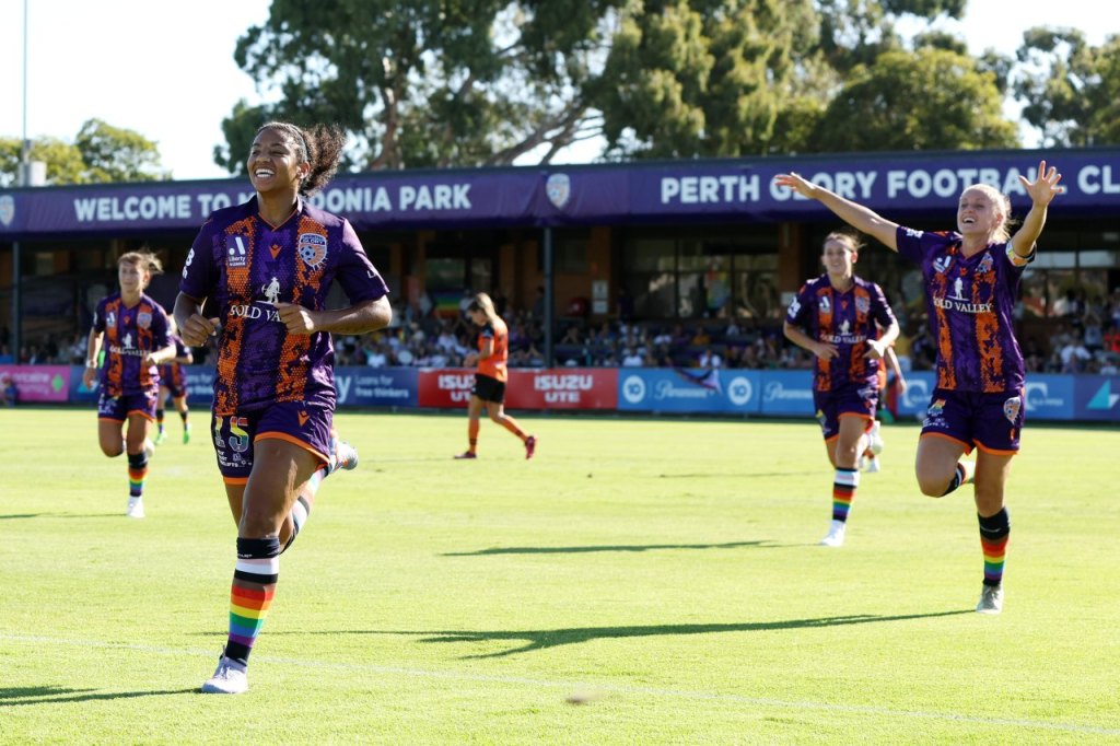 Above: Perth Glory’s hometown hero Hana Lowry celebrates after scoring both of her side’s goals today. Photo: Keep Up.