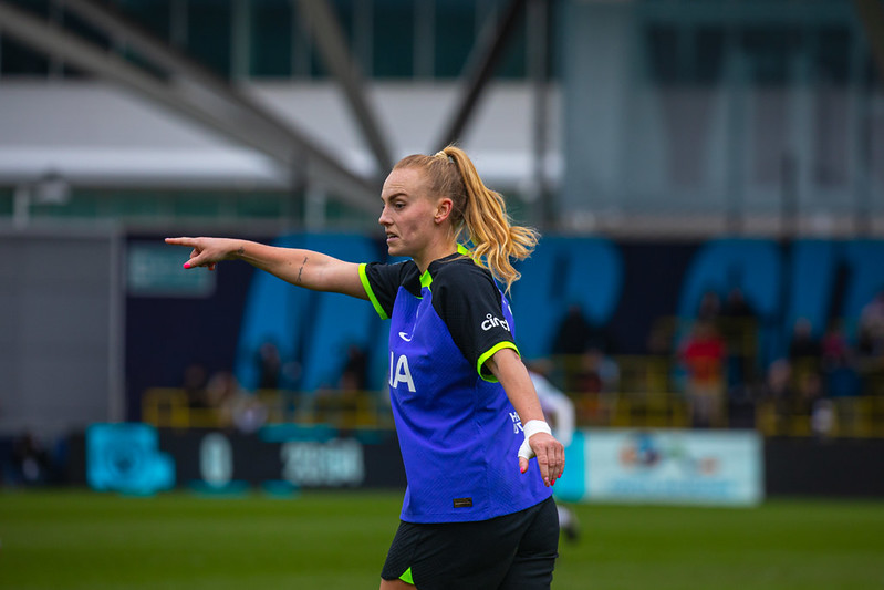 Above: Tottenham Hotspur’s Ashleigh Neville looks to make a clearance at the Academy Stadium yesterday. Photo: Matthew Appleby.