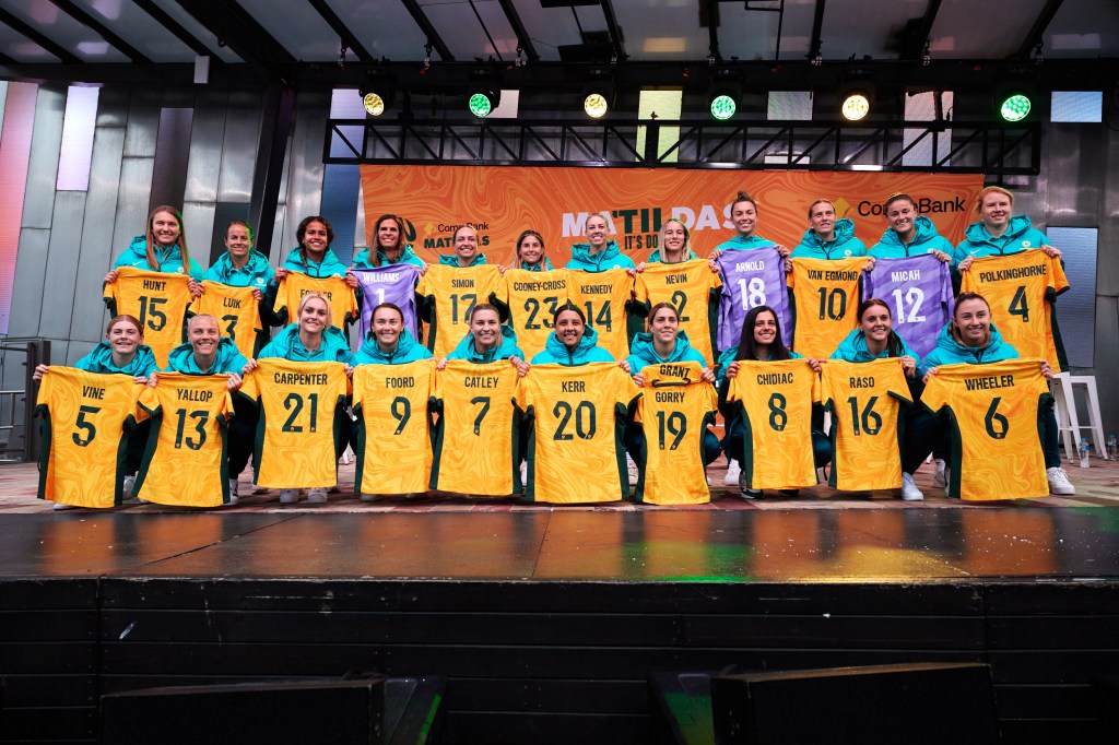 Above: The Matildas are presented with their World Cup jerseys at a public ceremony in Melbourne today. Photo: Tiff Williams/Football Australia.