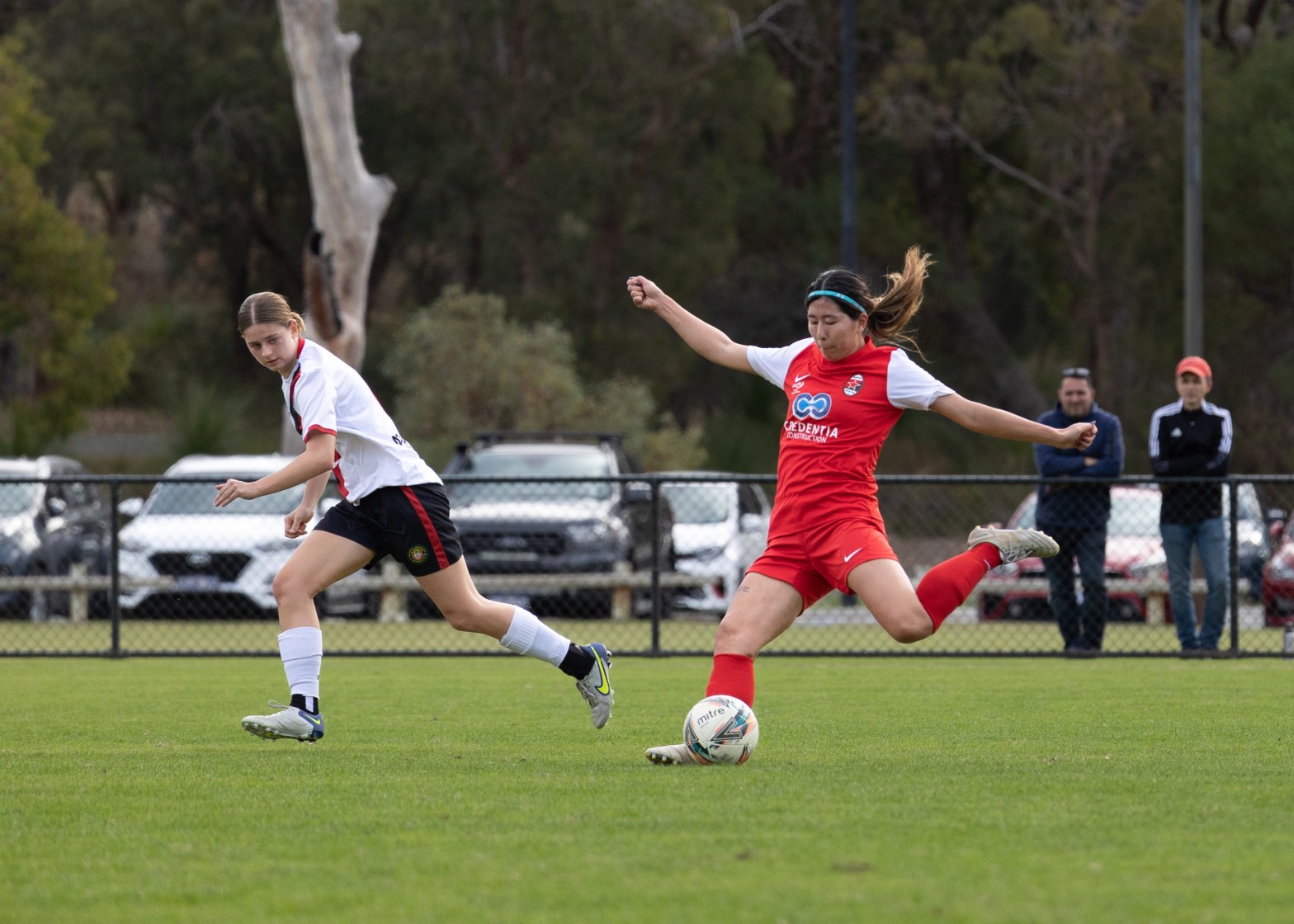 Above: Reina Kagami gets a shot in on goal for Perth RedStar against Murdoch University Melville. Photo: Robbie Anderson.