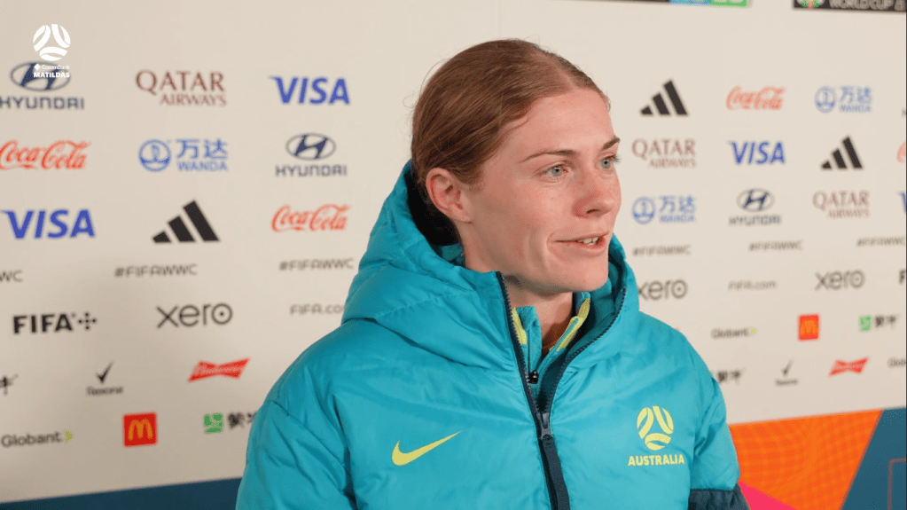 Above: Hayley Raso speaking to the media after today’s opening win at the World Cup for Australia. Image: Football Australia.
