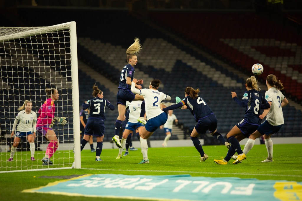 A melee in the Scottish box on 58 minutes saw the Lionesses nearly score again, with Kirby rattling the crossbar with a great effort after Charles and Mead had chances and were denied.