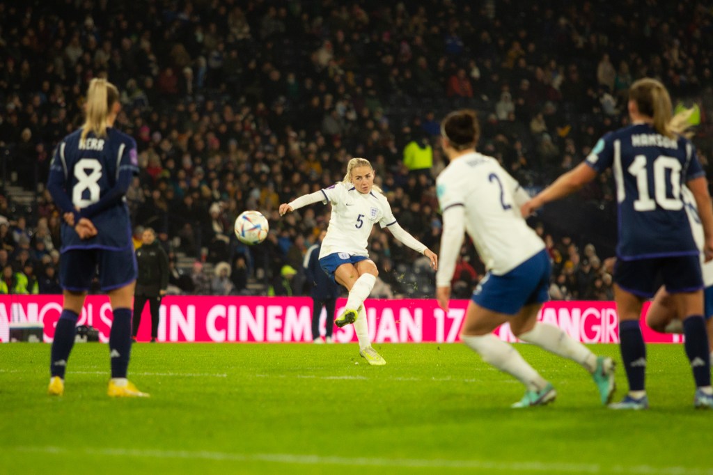 James doubled England’s advantage in the 37th minute and it took a slice of luck with the Chelsea star hitting a shot that took a deflection as it went past Scotland’s Gibson after the hosts failed to clear their lines after another England corner. Straight after the restart with Scotland rocked after conceding again, Niamh Charles ran at the Scottish defence before feeding the ball across shortly after for James’s second goal when she ran at the Scottish defence before feeding the edge of the box to an unmarked Chelsea and Lionesses team mate to finish superbly into the far corner of the net.