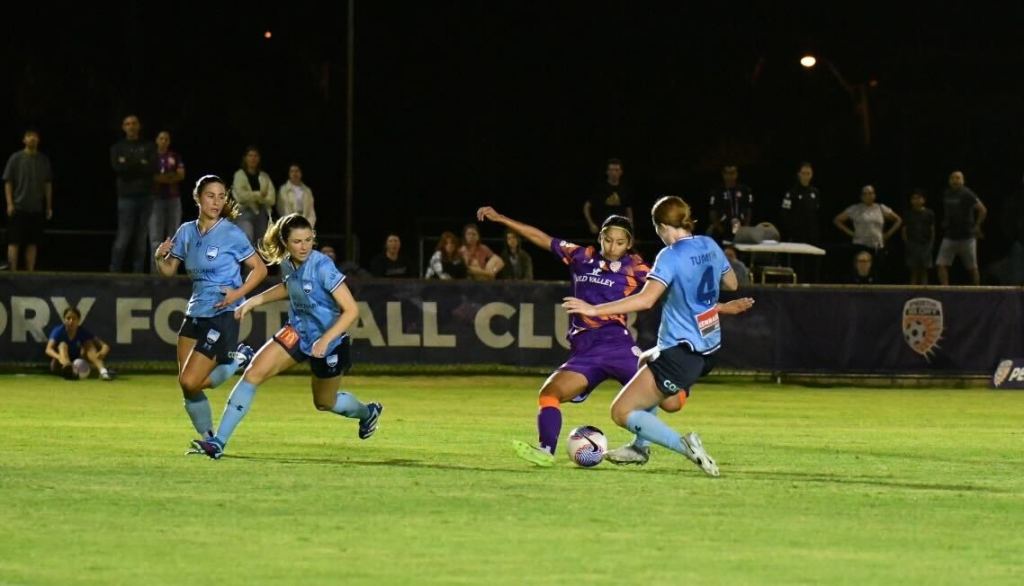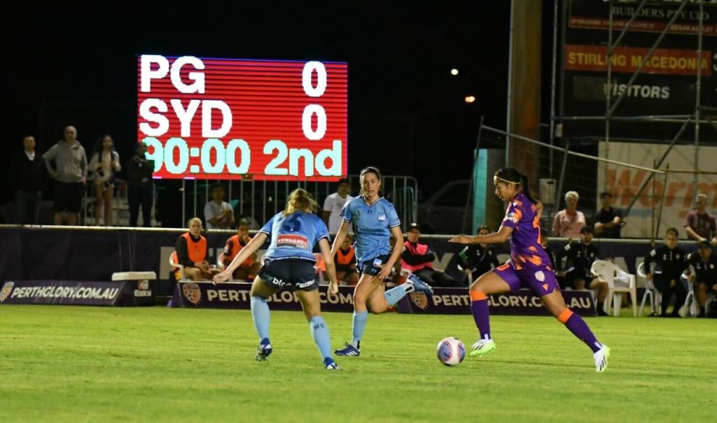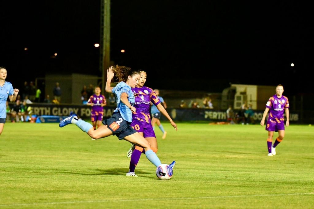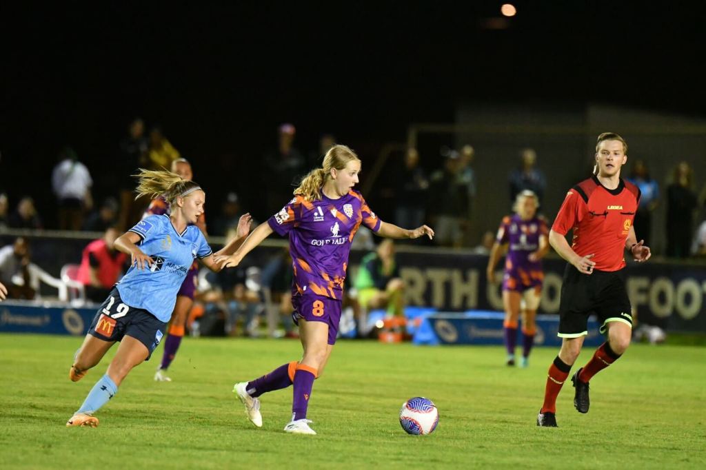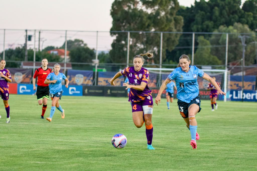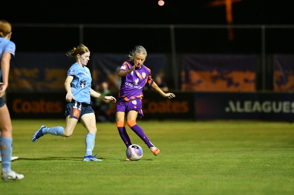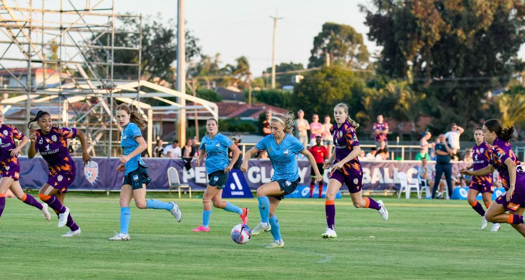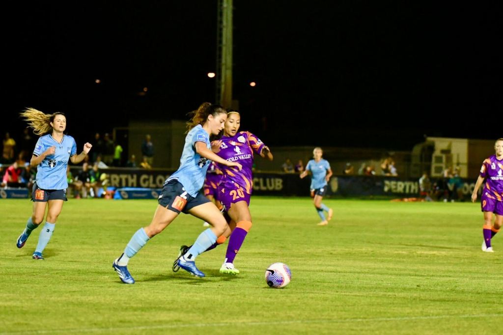 Just before the 10-minute mark, in-form Glory striker Millie Farrow looked to break through before being taken out on the edge of the box by Charlotte Mclean, who received a yellow card as a result. The free kick, right of centre on the edge of the ‘D’ was nullified by Sydney’s impressive rapid-fire press from Perth’s attempted training ground routine.