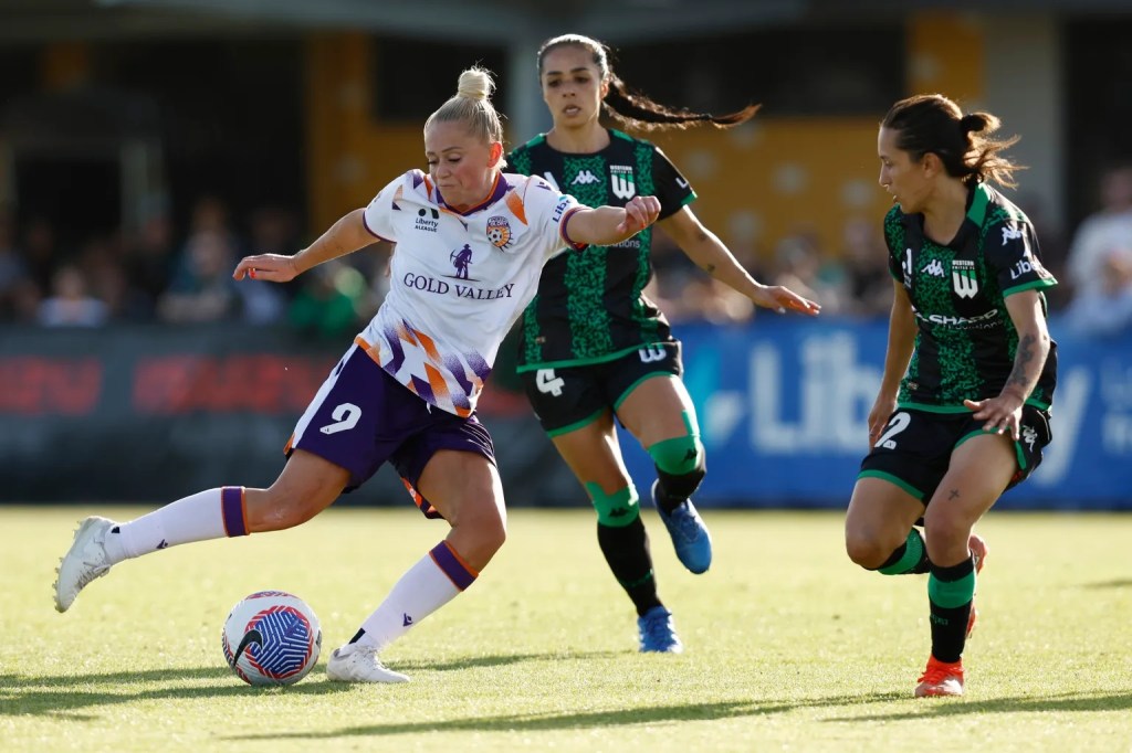 Logarzo and Keane’s partnership cranked up even further shortly afterwards with the latter threading a glorious ball that dissected three Perth defenders to find Logarzo who was eventually covered brilliantly by Sadie Lawrence at the cost of a corner. Tyla-Jay Vlajnić’s flag kick curled in and bounced off of the bar.