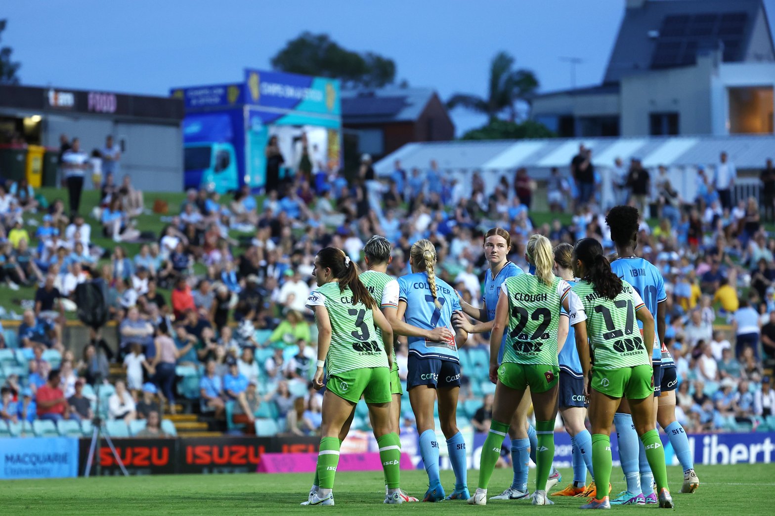 Above: Sydney FC and Canberra United players await a set piece. Photo: Canberra United.