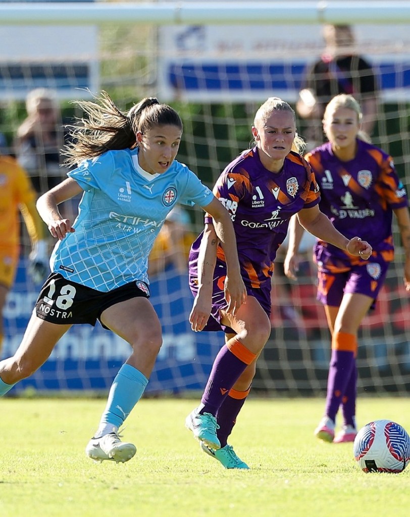 City had other ideas though and in the seventh minute, Rhianna Pollicina unleashed a cracking shot that beat Morgan Aquino’s strong effort to stop the goal. City made their own luck through playing a tough high press that forced the Glory to try and play out from their area. Pollicina received the ball from an innocuous throw in space and with a classy turn and accurate kick City went ahead.