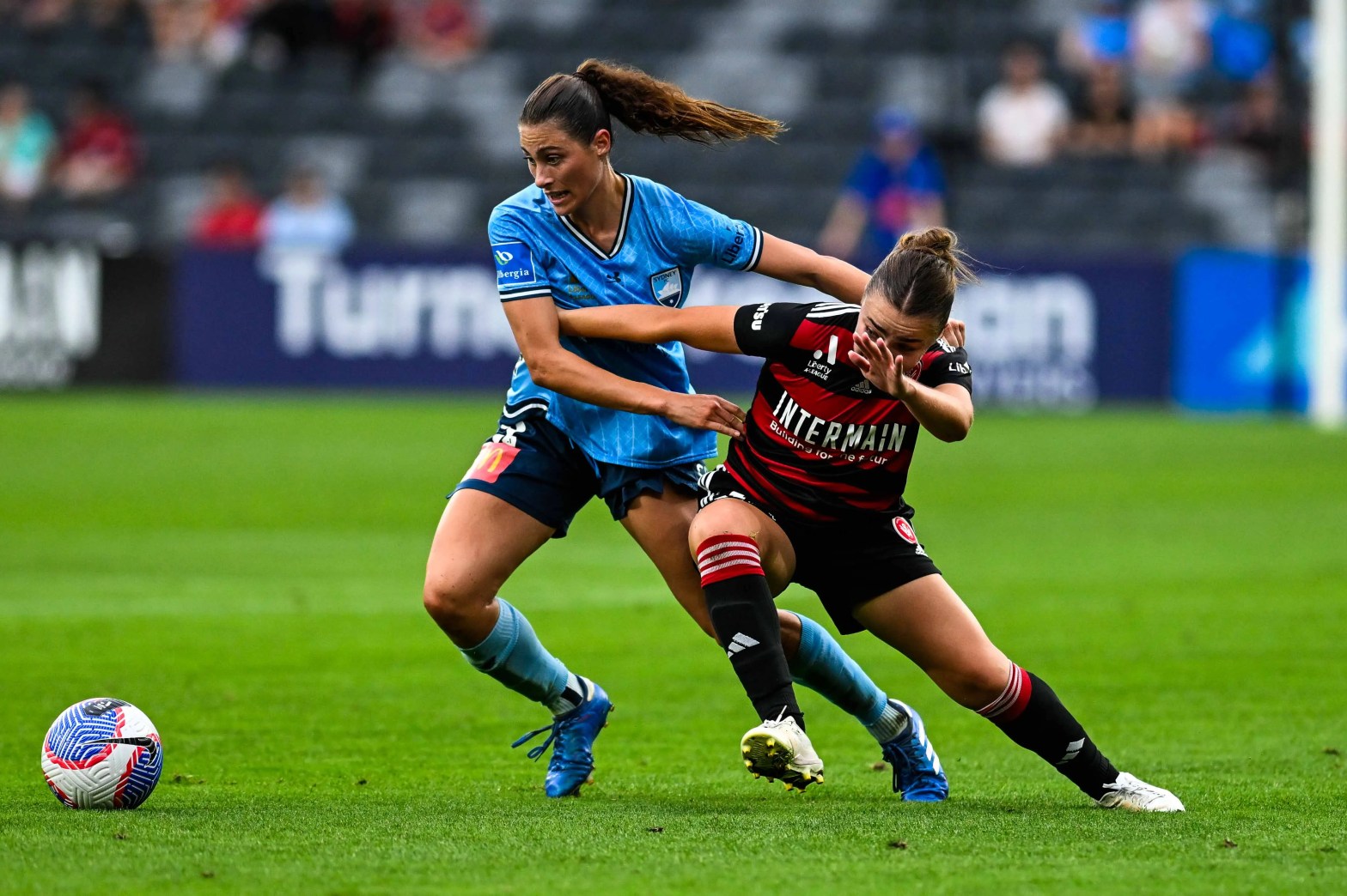 Above: Margaux Chauvet (blue) tussling with her former club. Image: Sydney FC.