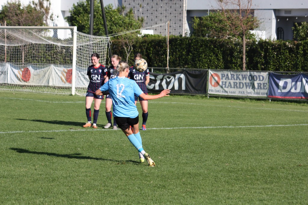 With their pocket rocket watching on from the sidelines on crutches after long term injury, Perth SC were not quite able to hit the heights at the pointy end as they were earlier in the campaign. Attacker Ella Lincoln was having to drop back deeper to gain possession, and trouble the high Balcatta line with her excellent touch and turns, but it meant she was over 10 yards further back than from the penalty box which made it harder to break through and trouble the visiting defence.