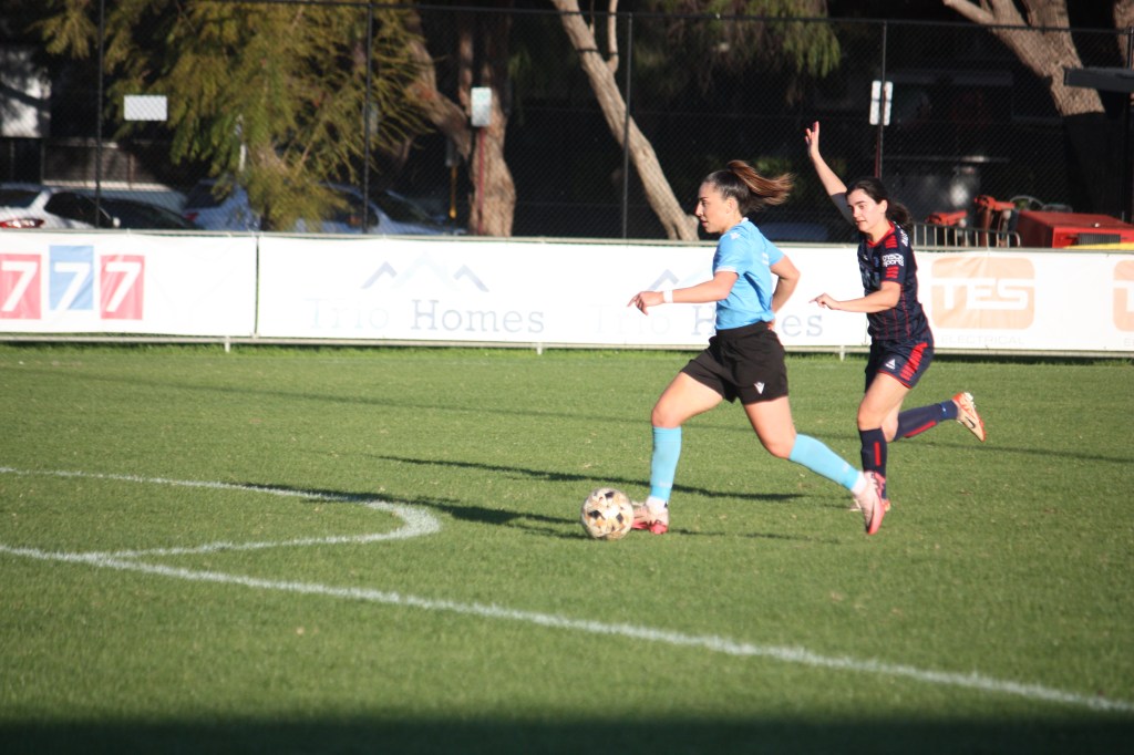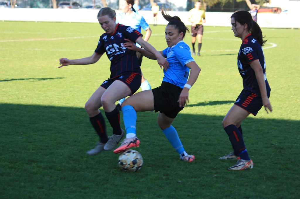 Above: Ella Lincoln (azure shirt) looks to break through for Perth SC this afternoon against Balcatta Etna. Photo: Ben Gilby for Impetus.