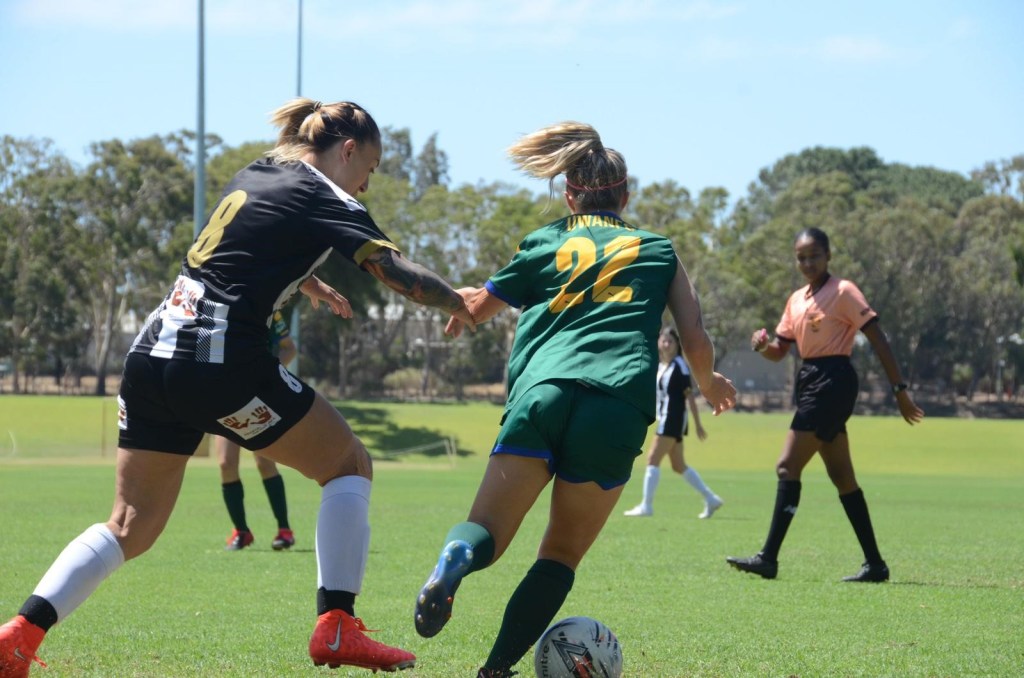 Above: Michaela Thawley (green shirt in possession) in action during UWA-Nedlands’ first NPLW WA match against Hyundai NTC – a game in which she scored. Photo supplied to Impetus by: UWA-Nedlands.