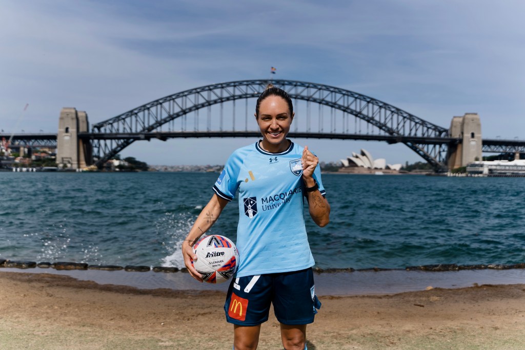 Above: Kyah Simon poses in front of the Harbour Bridge in her new colours. Image: Sydney FC.