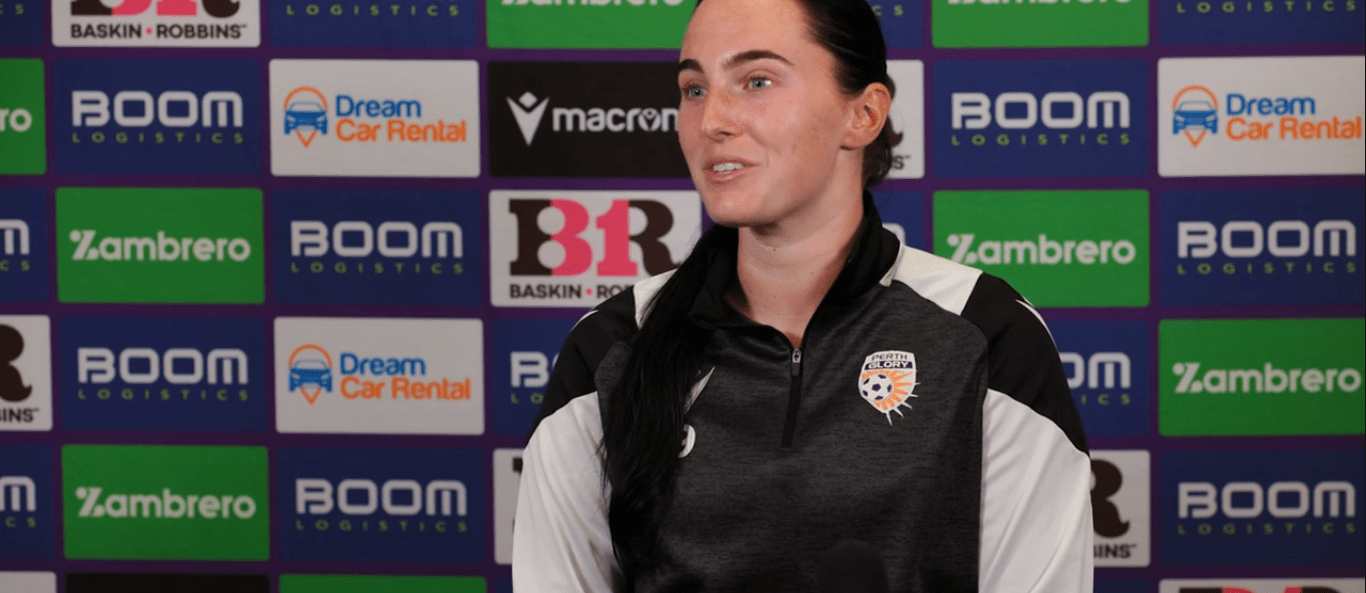 Above: Gabby Hollar talking to the media yesterday at the club’s base in Fremantle. Image: Perth Glory.