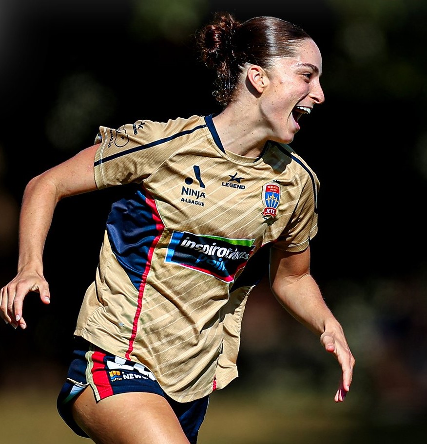 Above: Newcastle Jets’ Sophie Hoban shows her joy after scoring against Perth Glory today. Photo: A-Leagues.