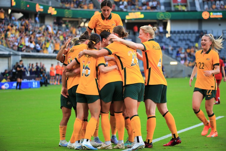 Above: Sam Kerr, Hayley Raso, and Tameka Yallop celebrate. Image: Football Australia.