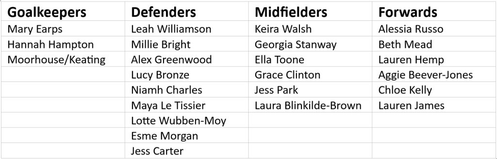 Defence is arguably going to be the most contentious part of the squad selection. With the reintroduction of Alex Greenwood (if fit), and potentially needing to fit in Lauren Hemp, Georgia Stanway and Lauren James, it is likely that the biggest cuts to the recent squads will come in defence.