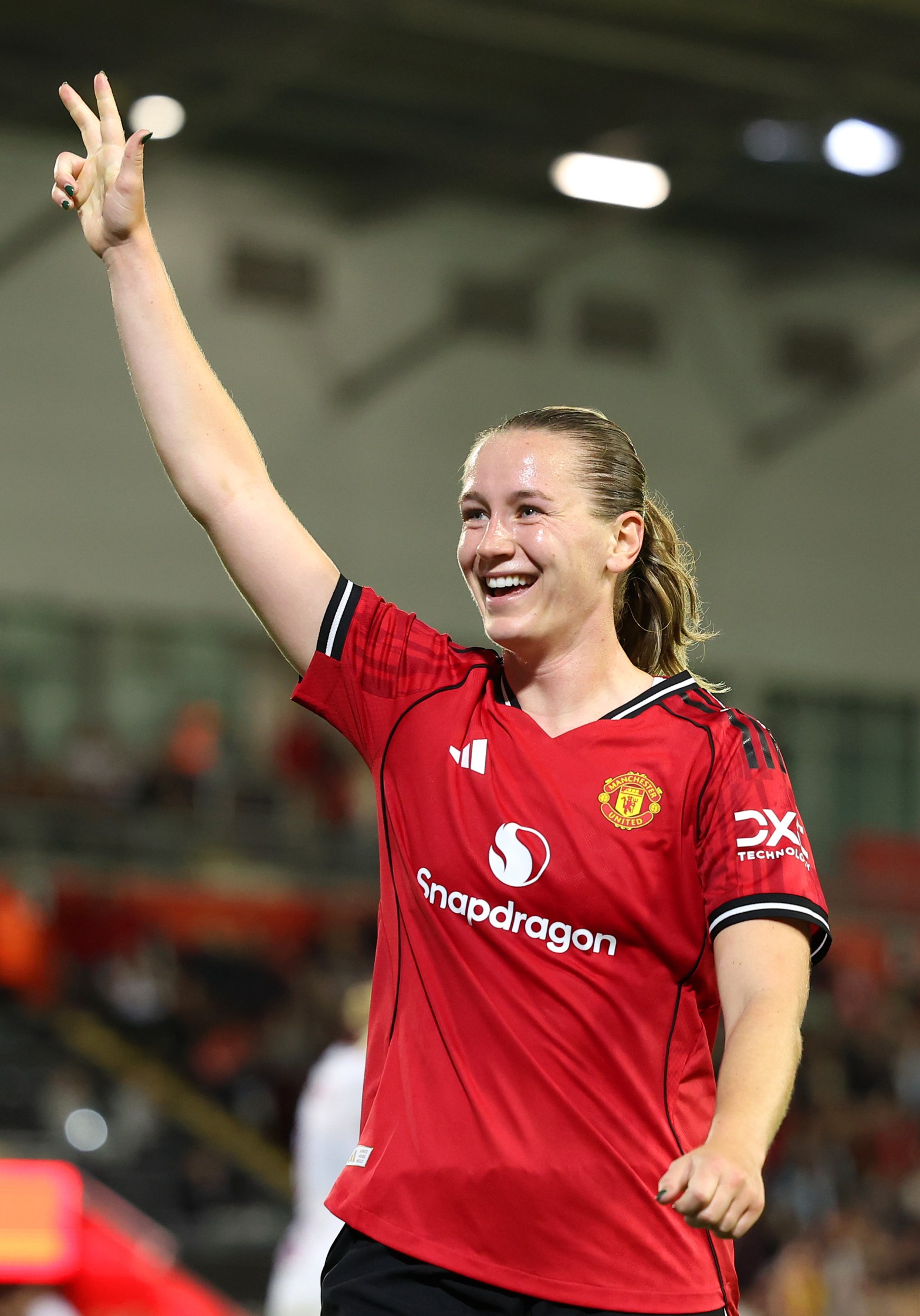 Above: United’s Elisabeth Terland celebrates her third goal. Photo: ManUtdWomen on X.