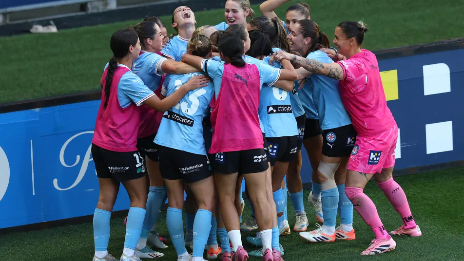 Above: Melbourne City celebrate after coming from behind to defeat cross town rivals Melbourne Victory. Photo: via A-Leagues.