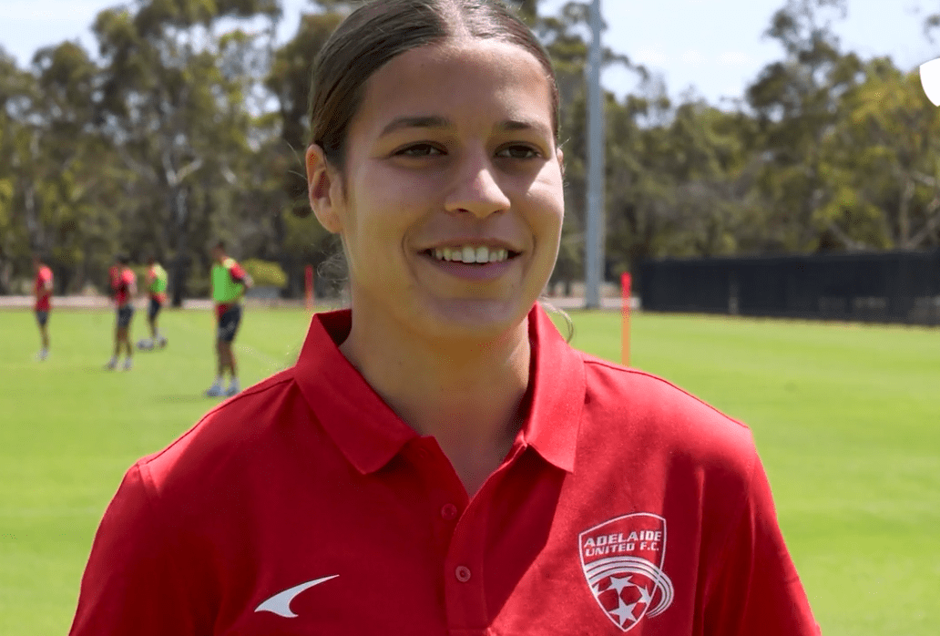 Above: Adelaide United’s Ella Tonkin talking to the media today. Image: Adelaide United.
