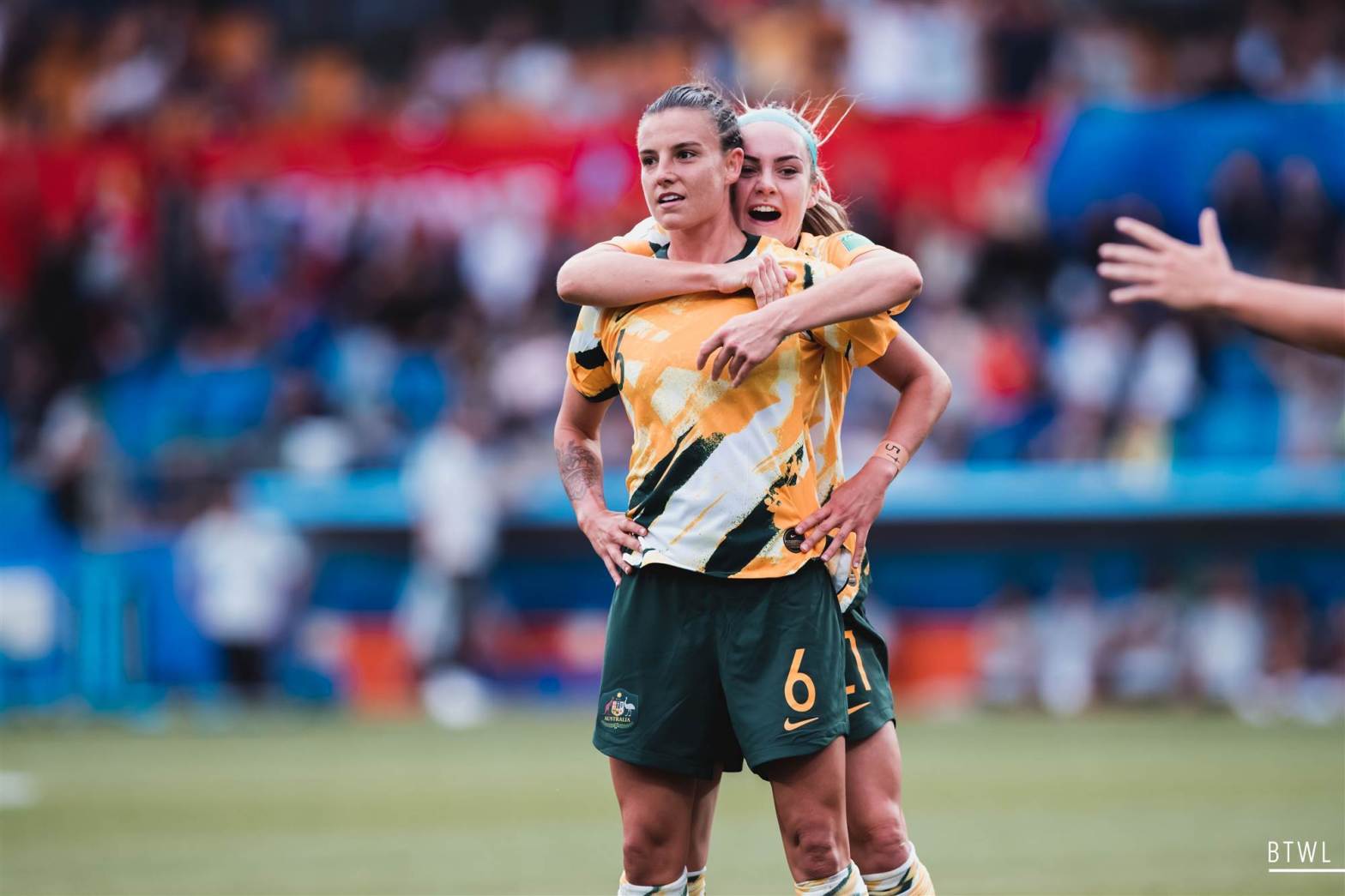 Above: Chloe Logarzo Berryhill celebrates at the 2019 Women’s World Cup with Matildas teammate Ellie Carpenter. Image: Rachel Bach/By The White Line for Football Australia.