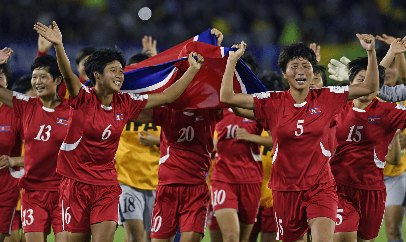 Above: The U-20 North Korean Women’s National Team celebrates their most recent World Cup win. Image: The Guardian.
