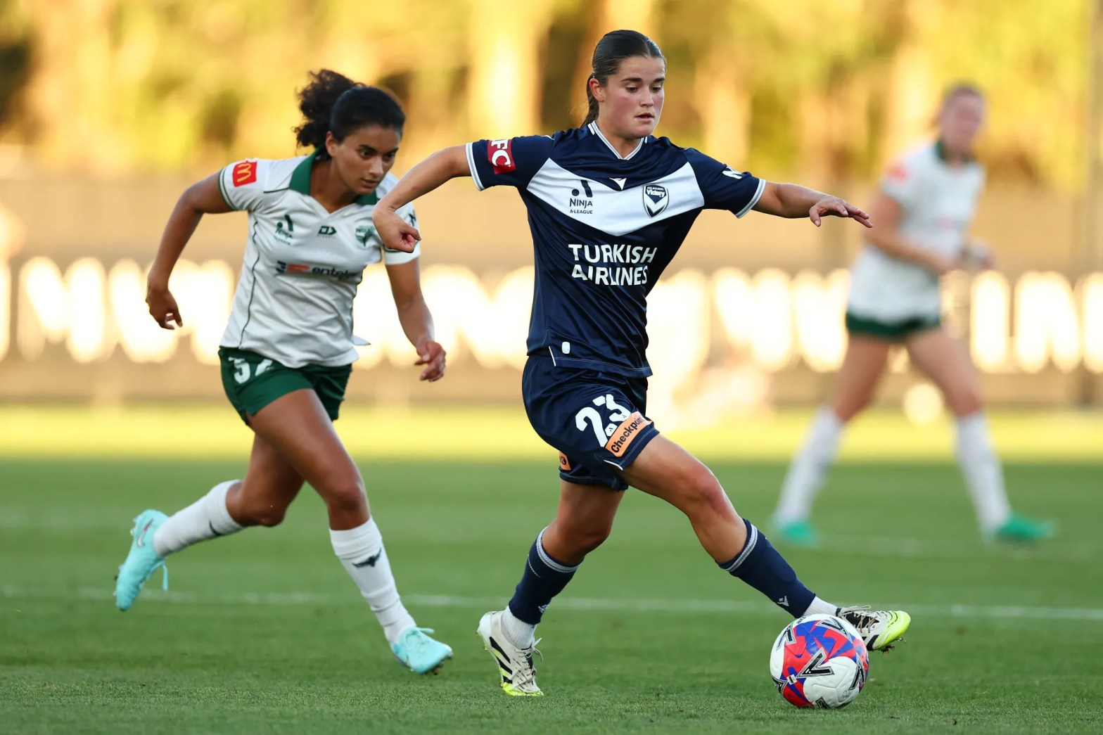 Above: Emma Pijnenburg (left) chases after Rachel Lowe (right). Photo: via Melbourne Victory.
