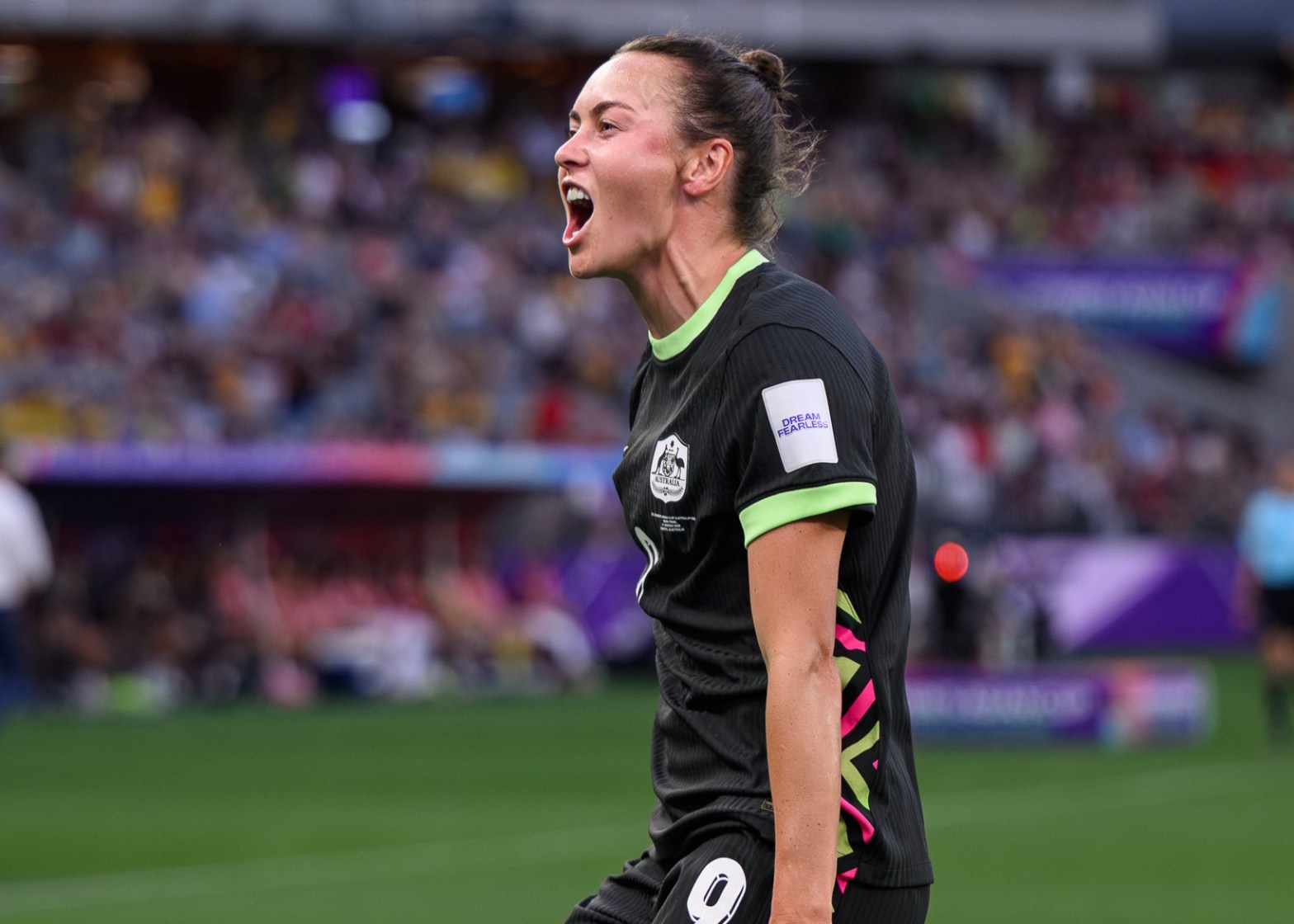 Above: Caitlin Foord celebrates after scoring tonight for Australia. Photo: Cat Bryant for Impetus.