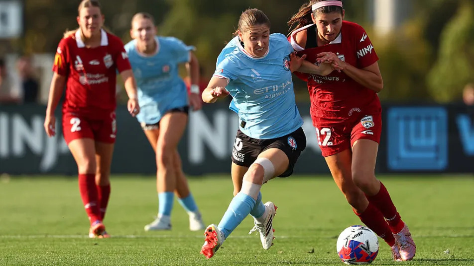 Above: Karly Roestbakken (blue uniform front) battles it out with Erin Healy (red uniform front) during this afternoon’s clash between Melbourne City and Adelaide United. Photo: via the A-Leagues.