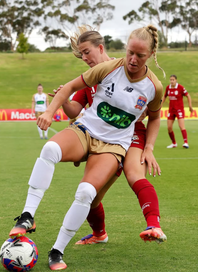 Above: Kelli Brown (white shirt), who scored two of Newcastle Jets’ goals battles away for possession today at ServiceFM Stadium. Photo: Newcastle Jets.