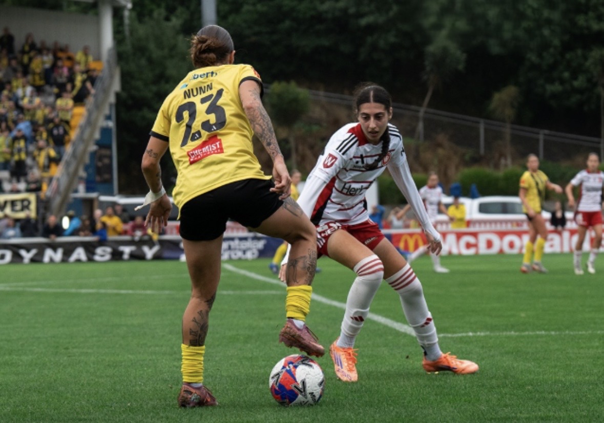 Above: Alvina Khoshaba (right, facing camera) competes for possession with Brooke Nunn. Photo: Wellington Phoenix