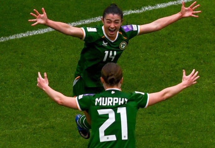 Above: Marissa Sheva (top) and Emily Murphy (bottom) celebrate after the former scored what turned out to be the match winning goal for the Girls in Green. Photo: via Ireland Football.