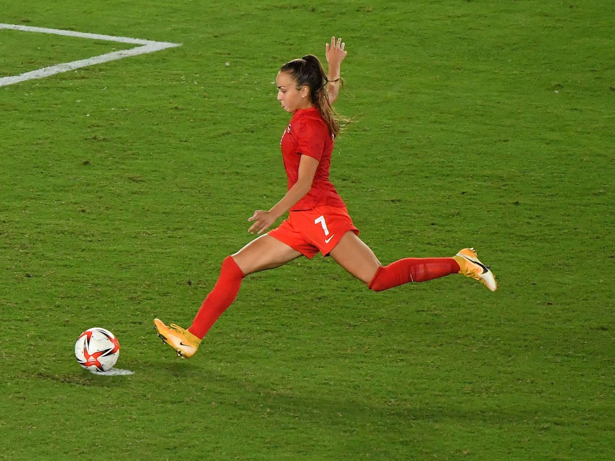 Canada’s midfielder Julia Grosso shoot and score during the penalty shoot-out of the Tokyo 2020 Olympic Games women’s final football match between Sweden and Canada at the International Stadium Yokohama in Yokohama on August 6, 2021. (Photo by Tiziana FABI / AFP) (Photo by TIZIANA FABI/AFP via Getty Images)