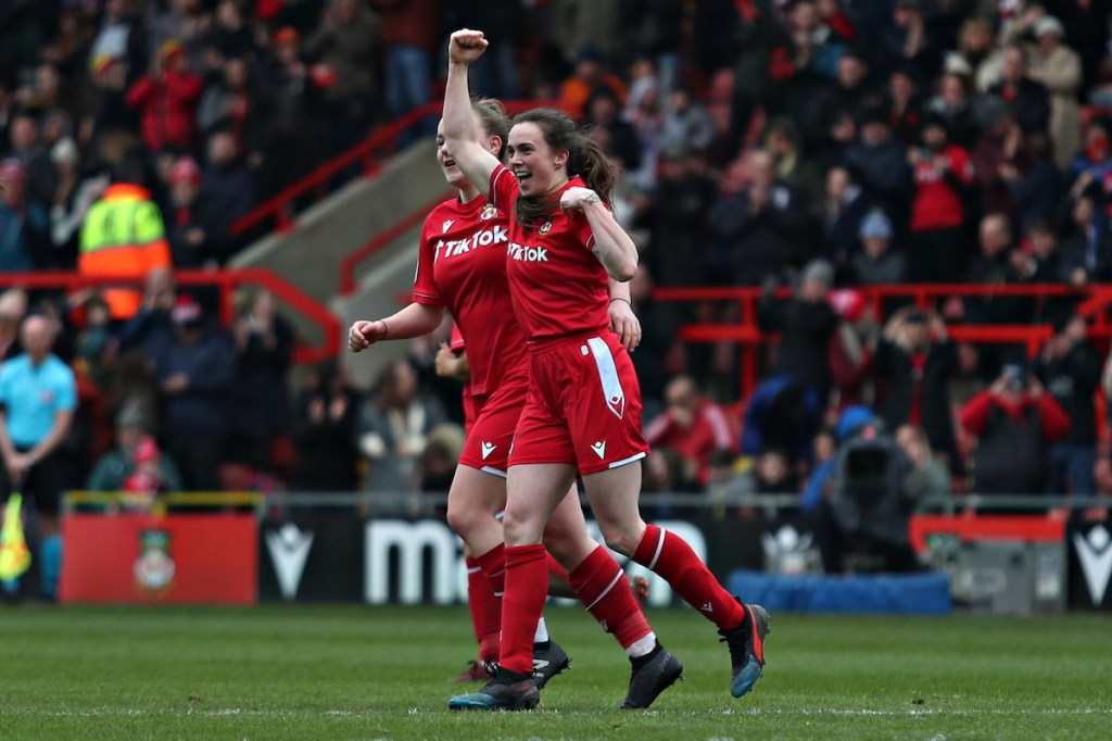 Above: Wrexham’s red hot striker Rosie Hughes celebrates scoring for the Adran North champions in front of over 9,000 fans at the Racecourse Ground against Connah’s Quay Nomads. Photo: Sam Eaden/FAW.