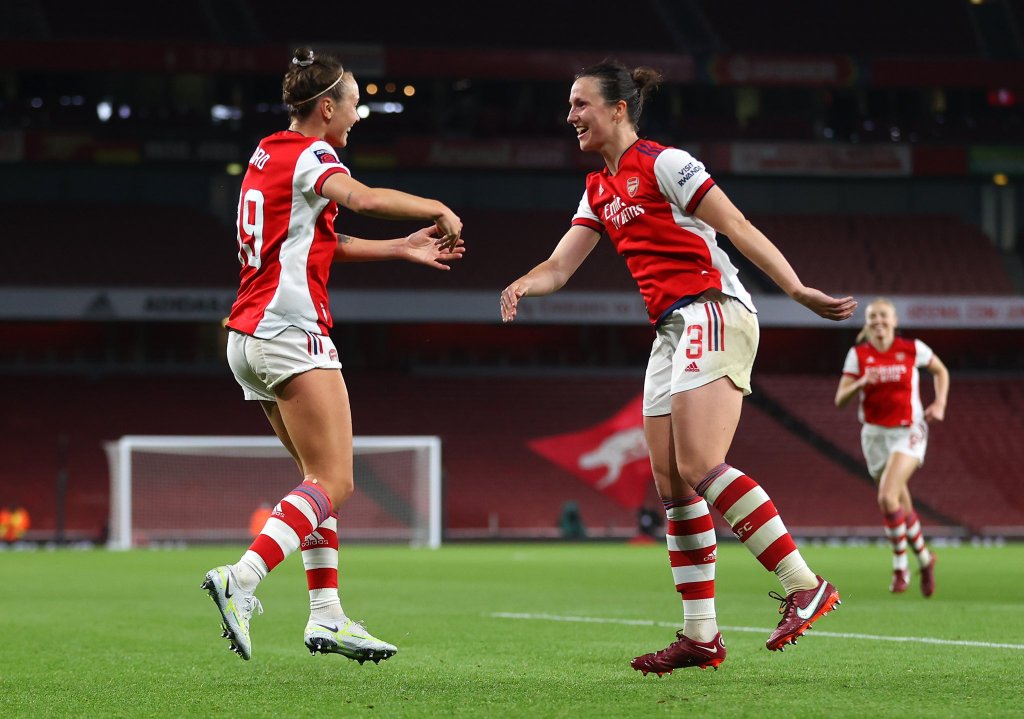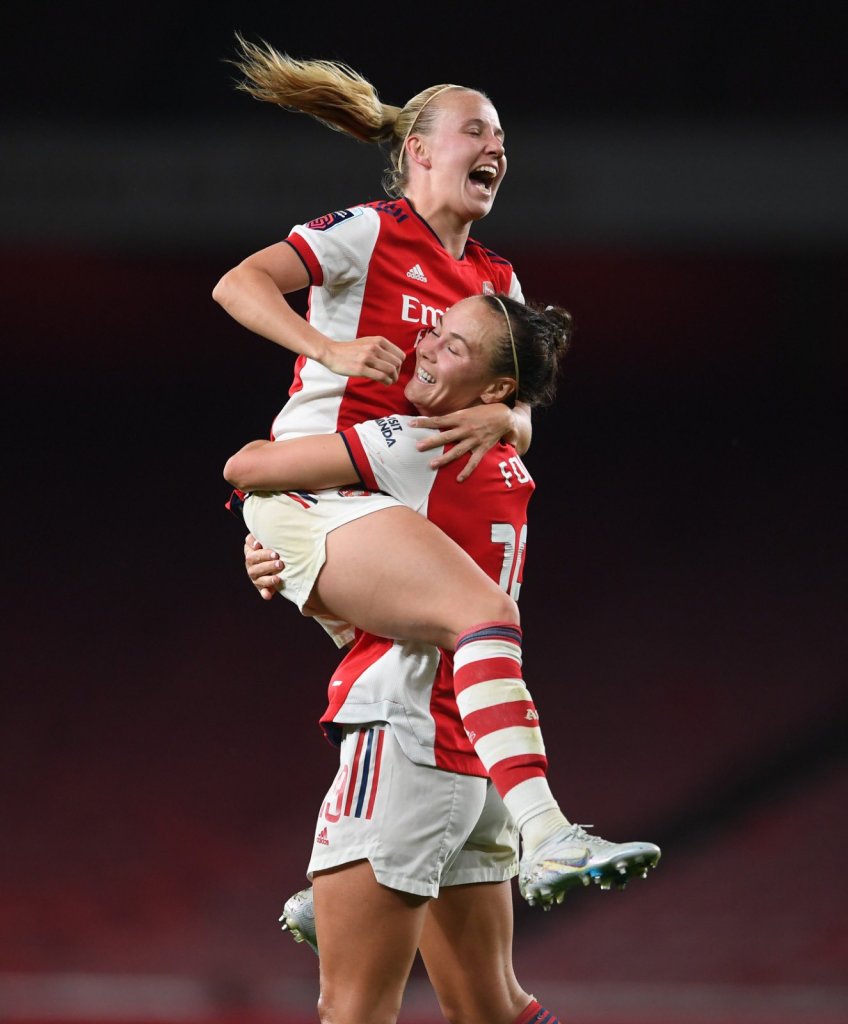 Above: Beth Mead and Caitlin Foord – Arsenal’s goal scorers and outstanding performers on the night. Photo: Arsenal WFC.